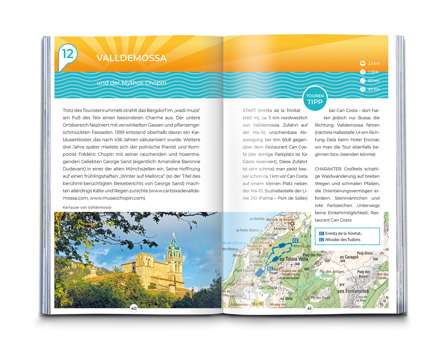 Besser vorher schon wissen, was es zu sehen gibt: Alle 37 Natur- und Wanderhighlights findest du im kompakten Reiseführer Inspiration Mallorca. Wasserfälle, einsame Buchten, atemberaubende Aussichten oder einmalige Bergdörfer. Wer will solche Geheim-Tipps nicht schon vor der Reise erfahren? Perfekt für die Urlaubsplanung. So bekommt man schnell einen Überblick, wie man das Beste aus dem Urlaub oder Kurzurlaub macht. Dabei liegt der Fokus voll auf der Natur und einem Aktiv-Urlaub. Vorgestellt werden alle Ziele mit der dazu passenden Wandertour. Eingezeichnet in einer Karte, kompakt beschrieben und mit einem Foto ausgestattet bekommst du schnell einen schönen Eindruck was dich erwartet.