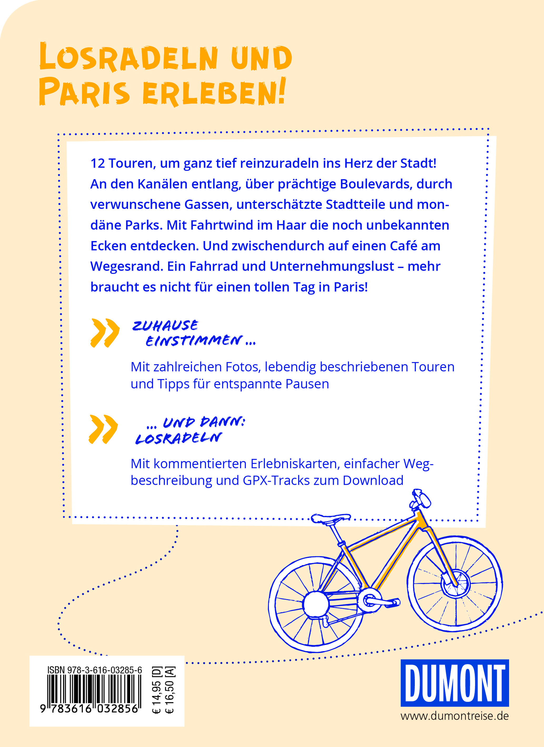Paris auf einer Radtour erleben! 12 Fahrradtouren, um ganz tief reinzuradeln ins Herz der Stadt. An den Kanälen entlang, über prächtige Boulevards, durch verwunschene Gassen, unterschätzte Stadtteile und mondäne Parks. Mit Fahrtwind im Haar die noch unbekannten Ecken entdecken. Und zwischendurch auf einen Café am Wegesrand. Ein Fahrrad und Unternehmungslust - mehr braucht es nicht für eine beschwingte Radtour durch Paris.