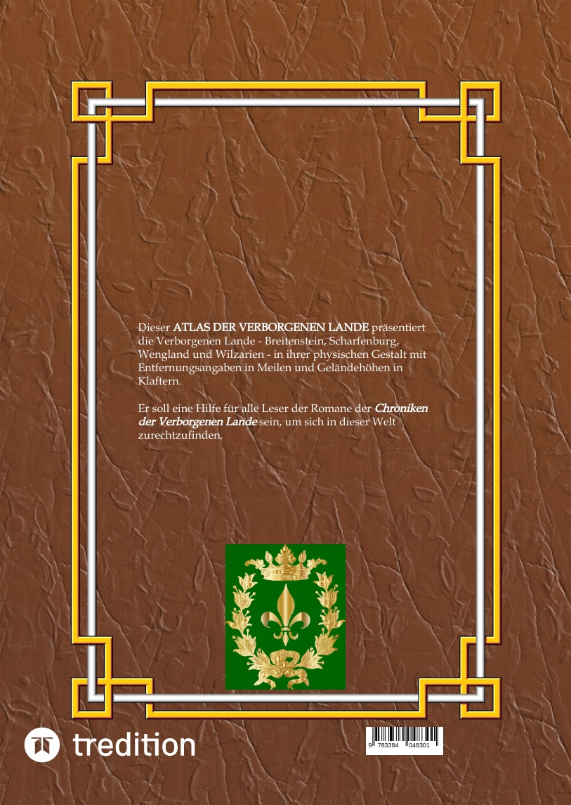 Für alle Leser der Chroniken der Verborgenen Lande, die sich fragen, wie die Verborgenen Lande eigentlich als Karte aussehen, die die Romane auch auf der Landkarte nachvollziehen wollen, ist dies die Antwort auf (hoffentlich) alle offenen Fragen: Der Atlas der Verborgenen Lande!Alle vier Lande - Breitenstein, Scharfenburg, Wengland und Wilzarien - sind in ihrer physischen Gestalt dargestellt, Entfernungen sind in Meilen an den Wegen und Geländehöhen in Klaftern angegeben, ein Register hilft bei der Auffindung gesuchter Orte, Verwaltungsbezirke, Bergen, Seen, Flüsse oder Sehenswürdigkeiten. Unentbehrlich für alle, die mehr über diese Welt wissen wollen!