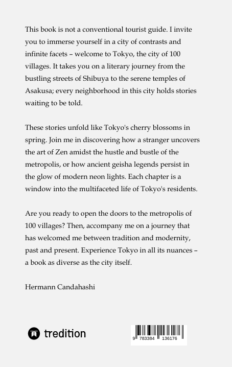 This book is not a conventional travel guide. I would like to invite you to immerse yourself in a city of contrasts and endless facets - welcome to Tokyo, the city of 100 villages. This book takes you on a literary journey from the bustling streets of Shibuya to the serene temples of Asakusa; each neighborhood in this city holds stories waiting to be told.These stories unfold like Tokyo's cherry blossoms in spring. Join me in discovering how a stranger uncovers the art of Zen amid the hustle of the metropolis or how ancient geisha legends persist in the glow of modern neon lights. Each chapter is a window into the diverse life worlds of Tokyo's population.Are you ready to open the doors to the metropolis of 100 villages? Then accompany me on a journey that has embraced me between tradition and modernity, past and present. Experience Tokyo in all its nuances - a book as diverse as the city itself.So, I warmly welcome you to my Tokyo stories. This book takes you on a journey through the bustling streets of the megametropolis Tokyo and at the same time to the hidden treasures of the surrounding villages, as I experienced them.Through the eyes of a stranger who not only admires the breathtaking skyline but also discovers the stories behind the facades of the seemingly endless skyscrapers, I guide you through this foreign world. We explore not only the neon-lit streets but also the heart of the culture in the villages that make up this metropolis.In "Tokyo Stories," the diversity of this fascinating city becomes palpable in all its facets. From the bustling shopping districts to the quiet temples on the outskirts - each place tells its own story. Let yourself be surprised by the contrasts as the bustle of the metropolis meets the serenity of quiet communities, teahouses, and temples.My book is more than just a travel description. It is an exploration of the soul of Tokyo, an invitation to understand the city in its entirety. Through vivid descriptions and compelling stories, you will dive into the cultural diversity that Tokyo has to offer. Get ready for a journey that leads you not only through the streets but also into the hearts of the people who make this city what it is.I aim to build a bridge between the past and the future, between tradition and innovation. Explore the magic of this unique metropolis and let me tell you about the stories hidden behind the skyscrapers and rice terraces.Join me on this unforgettable journey. Are you ready to discover the city of 100 villages? Then follow me.Yours sincerely,Hermann Candahashi