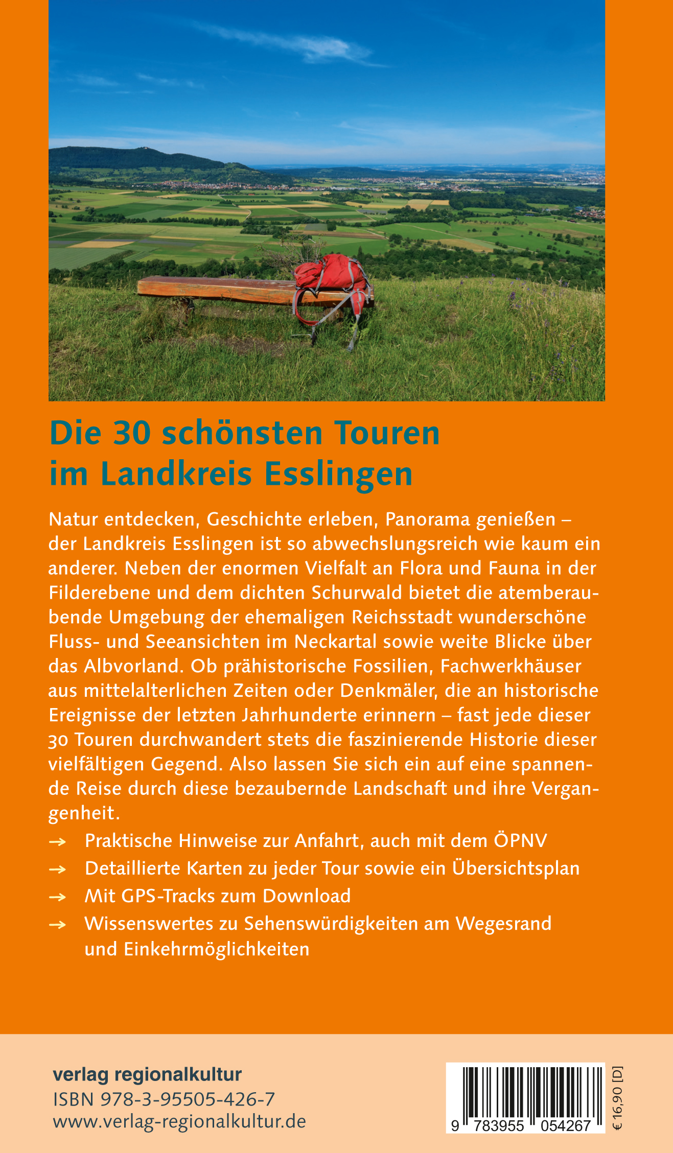Die 30 schönsten Touren im Landkreis EsslingenNatur entdecken, Geschichte erleben, Panorama genießen - der Landkreis Esslingen ist so abwechslungsreich wie kaum ein anderer. Neben der enormen Vielfalt an Flora und Fauna in der Filderebene und dem dichten Schurwald bietet die atemberaubende Umgebung der ehemaligen Reichsstadt wunderschöne Fluss- und Seeansichten im Neckartal sowie weite Blicke über das Albvorland. Ob prähistorische Fossilien, Fachwerkhäuser aus mittelalterlichen Zeiten oder Denkmäler, die an historische Ereignisse der letzten Jahrhunderte erinnern - fast jede dieser ¬30 Touren durchwandert stets die faszinierende Historie dieser vielfältigen Gegend. Also lassen Sie sich ein auf eine spannende Reise durch diese bezaubernde Landschaft und ihre Vergangenheit. Praktische Hinweise zur Anfahrt, auch mit dem ÖPNV Detaillierte Karten zu jeder Tour sowie ein Übersichtsplan Mit GPS-Tracks zum Download Wissenswertes zu Sehenswürdigkeiten am Wegesrand und Einkehrmöglichkeiten
