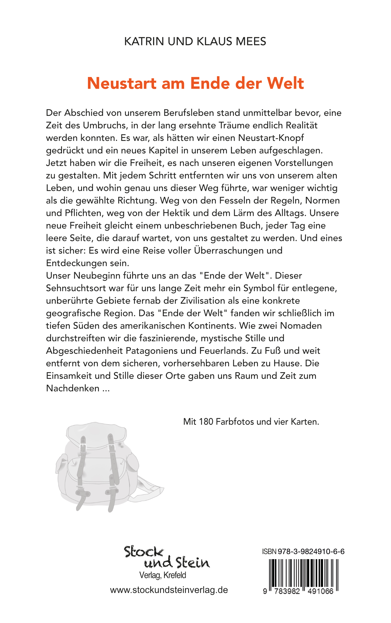 Eine Hommage an Patagonien, das Leben draußen und die Freiheit. – Mit den Möglichkeiten für das Leben nach dem letzten Arbeitstag konnten Katrin und Klaus Mees sich rechtzeitig beschäftigen, denn schon ihr ganzes Leben gehört das Reisen zu ihrer größten Leidenschaft. Das enge Zeitkorsett der beruflichen Tätigkeit lassen sie nun endgültig hinter sich. Sie entdecken beim Trekking am Ende der Welt die Einsamkeit und die verborgenen Besonderheiten, die Patagonien und Feuerland demjenigen zu bieten haben, der seine Chancen erkennt und das Leben aktiv gestaltet. Sie wandern durch stille Täler, durchklettern gewaltige Gebirge und reisen zu Pinguinkolonien in der Antarktis. Nicht selten sind Herausforderungen und Zweifel ihre Begleiter, aber der Neustart in ein neues Leben bedeutet auch die pure Freiheit.