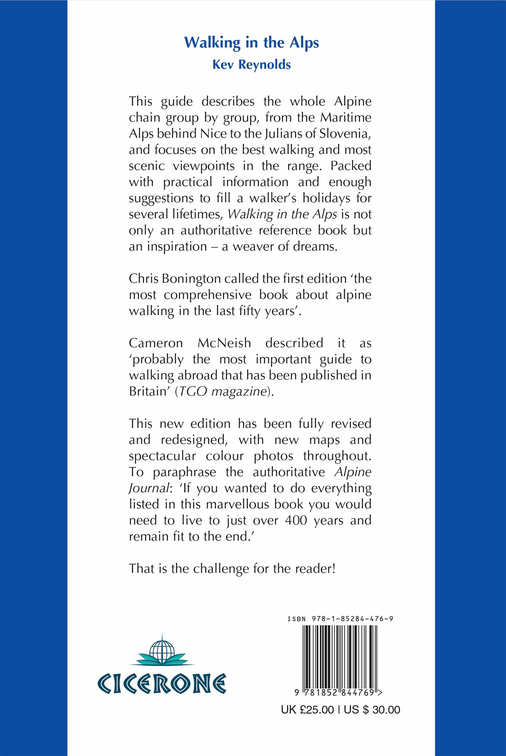 The second edition of this classic guidebook by Kev Reynolds on walking and trekking in the Alps. This book is a definitive guide to the many thousands of possible routes, with a geographical span that ranges from the Maritime Alps of southern France to the Julians of Slovenia, from Italy's Gran Paradiso to the little-known Türnitzer Alps of eastern Austria, and from the ice-bound giants of the Bernese Oberland to the green rolling Kitzbüheler Alps and the bizarre towers of the Dolomites of South Tirol, showing the amazing diversity of this wonderful mountain chain. There are walks to suit every taste: gentle and undemanding, long and tough, and everything in between. Written by Britain's most respected authority on the Alps, this is a fully updated edition of this important book.