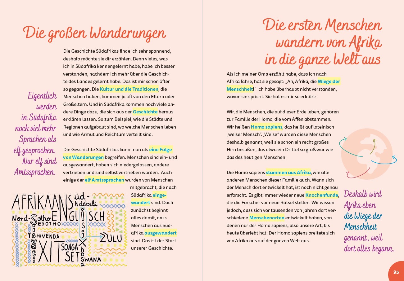 Südafrika for kids ist ein Reiseführer für Kinder, der geballtes Kinderwissen über die Tiere, Pflanzen, Essen und Trinken sowie die Kultur der Südafrikaner bietet und viel Spaß macht. Enthalten sind darüberhinaus ein kleiner Sprachführer und viele Infos über die Tiere in den Nationalparks, Wissenswertes und Lifehacks für Kids beim Camping und auf Safari und viele Informationen zu Pflanzen und der Landschaft Südafrikas. Außerdem wird die wechselvolle Geschichte des Landes erzählt, kindgerecht und gut verständlich, mit vielen bunten Illustrationen und vielen schlauen Infos - natürlich nur für Kinder.