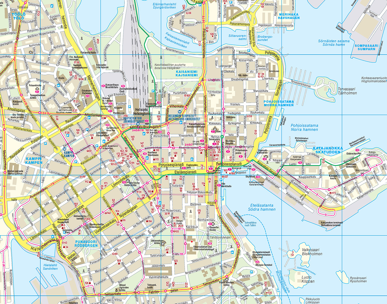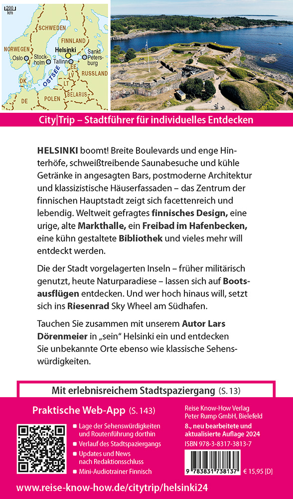 Dazu: kostenlose Web-App für Smartphone, Tablet und PC mit Stadtplan- und Satellitenansichten passend zum Text, Routenführung zu allen beschriebenen Sehenswürdigkeiten, Verlauf des Stadtspaziergangs, seitenbezogenen Updates nach Redaktionsschluss sowie einem Mini-Audiotrainer Finnisch