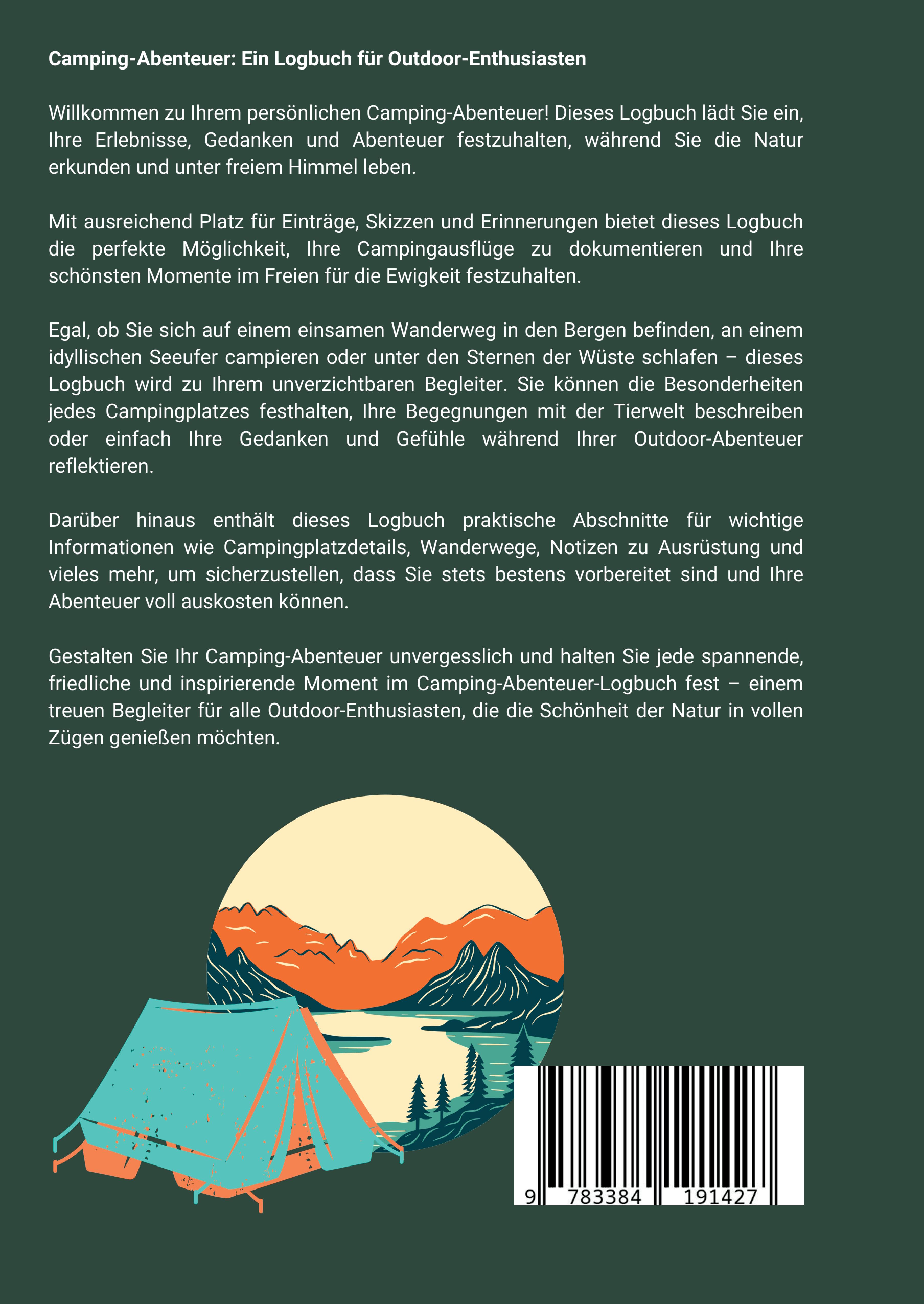 Camping-Abenteuer: Ein Logbuch für Outdoor-EnthusiastenWillkommen zu Ihrem persönlichen Camping-Abenteuer! Dieses Logbuch lädt Sie ein, Ihre Erlebnisse, Gedanken und Abenteuer festzuhalten, während Sie die Natur erkunden und unter freiem Himmel leben.Mit ausreichend Platz für Einträge, Skizzen und Erinnerungen bietet dieses Logbuch die perfekte Möglichkeit, Ihre Campingausflüge zu dokumentieren und Ihre schönsten Momente im Freien für die Ewigkeit festzuhalten.Egal, ob Sie sich auf einem einsamen Wanderweg in den Bergen befinden, an einem idyllischen Seeufer campieren oder unter den Sternen der Wüste schlafen - dieses Logbuch wird zu Ihrem unverzichtbaren Begleiter. Sie können die Besonderheiten jedes Campingplatzes festhalten, Ihre Begegnungen mit der Tierwelt beschreiben oder einfach Ihre Gedanken und Gefühle während Ihrer Outdoor-Abenteuer reflektieren.Darüber hinaus enthält dieses Logbuch praktische Abschnitte für wichtige Informationen wie Campingplatzdetails, Wanderwege, Notizen zu Ausrüstung und vieles mehr, um sicherzustellen, dass Sie stets bestens vorbereitet sind und Ihre Abenteuer voll auskosten können.Gestalten Sie Ihr Camping-Abenteuer unvergesslich und halten Sie jede spannende, friedliche und inspirierende Moment im Camping-Abenteuer-Logbuch fest - einem treuen Begleiter für alle Outdoor-Enthusiasten, die die Schönheit der Natur in vollen Zügen genießen möchten.Details:-Mit Fragen zur Reise-Pro Tour steht eine Doppelseite zur Verfügung-Genug Platz für Fotos und Erinnerungen, Notizen-100 Seiten-im Format A5-Platz für 45 Reisen-Liebevoll gestaltetDieses besondere Logbuch ist eine perfekte Geschenkidee für:-Abenteurer und Camper, die ihre Erlebnisse festhalten und schätzen möchten.