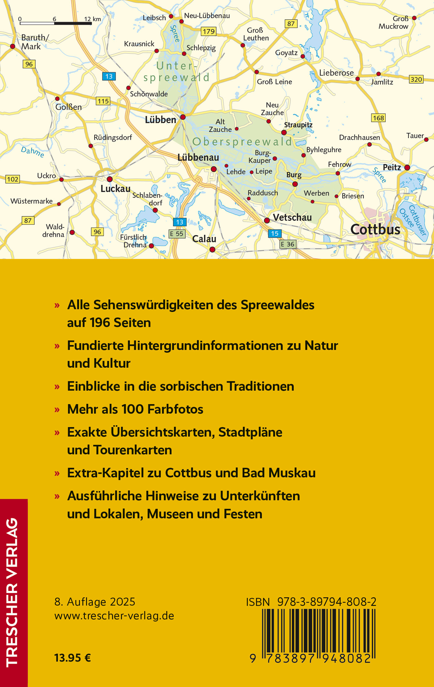 Neben einer Einführung in Geschichte und Gegenwart der Region bietet der Trescher-Reiseführer SPREEWALD spannende Hintergrundinformationen zur landschaftlichen und kulturellen Entwicklung, zur Schleusentechnik, zu Sagengestalten, der sorbischen Sprache und vielem mehr. Mit zahlreichen Tourenbeschreibungen zu Wasser und zu Land, Tipps für Tagesausflüge, Unterkunft und Gastronomie sowie Empfehlungen für Wellnesswochenenden ist dieses Buch ein kundiger Begleiter für Aktivurlauber, Familien und Kulturinteressierte, die die zauberhafte Spreewald-Landschaft entdecken möchten.