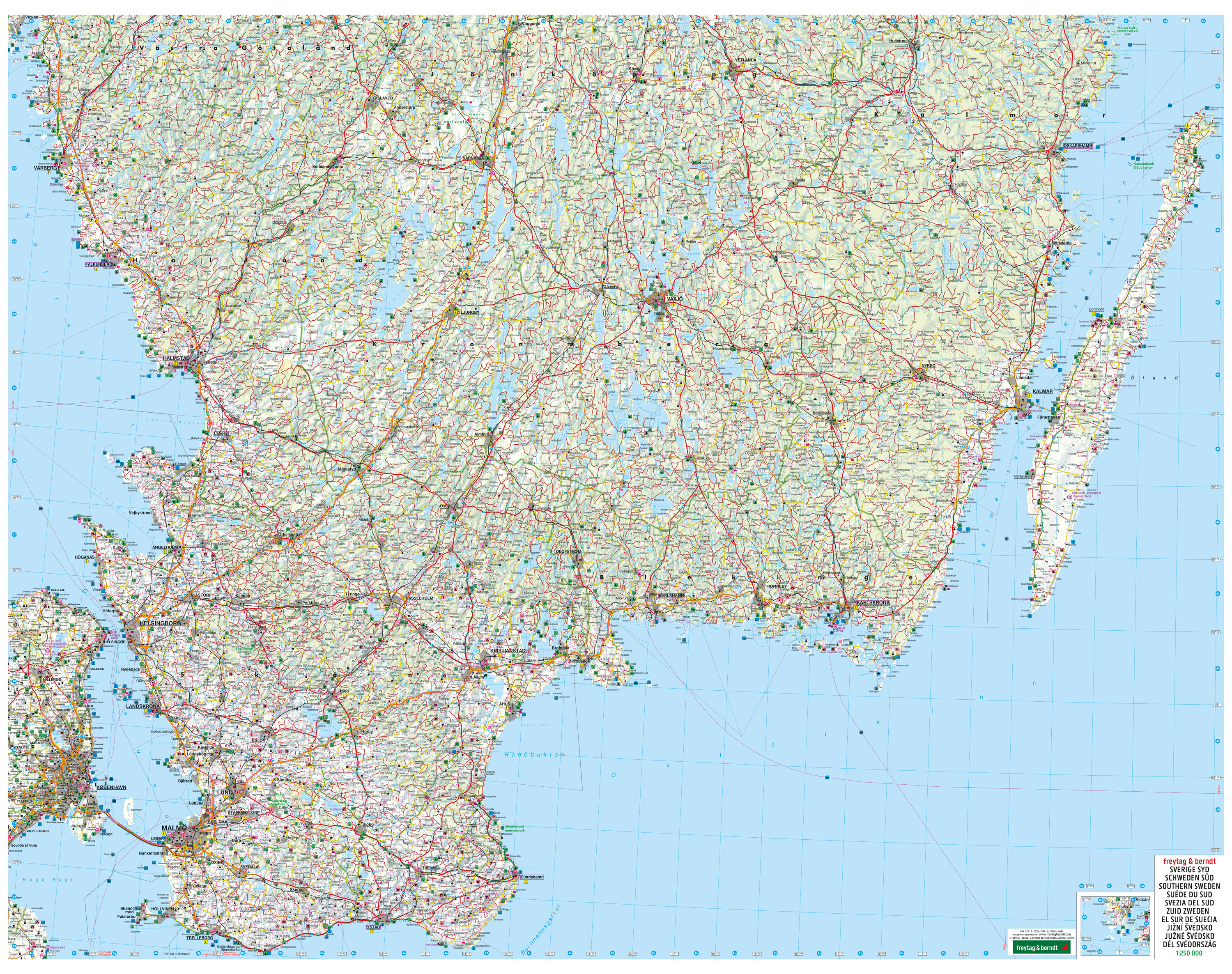 Der Süden Schwedens bietet eine Vielzahl von Aktivitäten und Sehenswürdigkeiten für Urlauber. Mit der Straßenkarte Schweden Süd im Maßstab 1:250.000 finden sich Aktivurlauber die mit dem Auto, Motorrad oder Wohnwagen in Schweden unterwegs sind bestens zurecht. Das weit verzweigte Straßennetz ist exakt abgebildet, Entfernungen und touristische Ausflugsziele sind in der Karte eingezeichnet.
