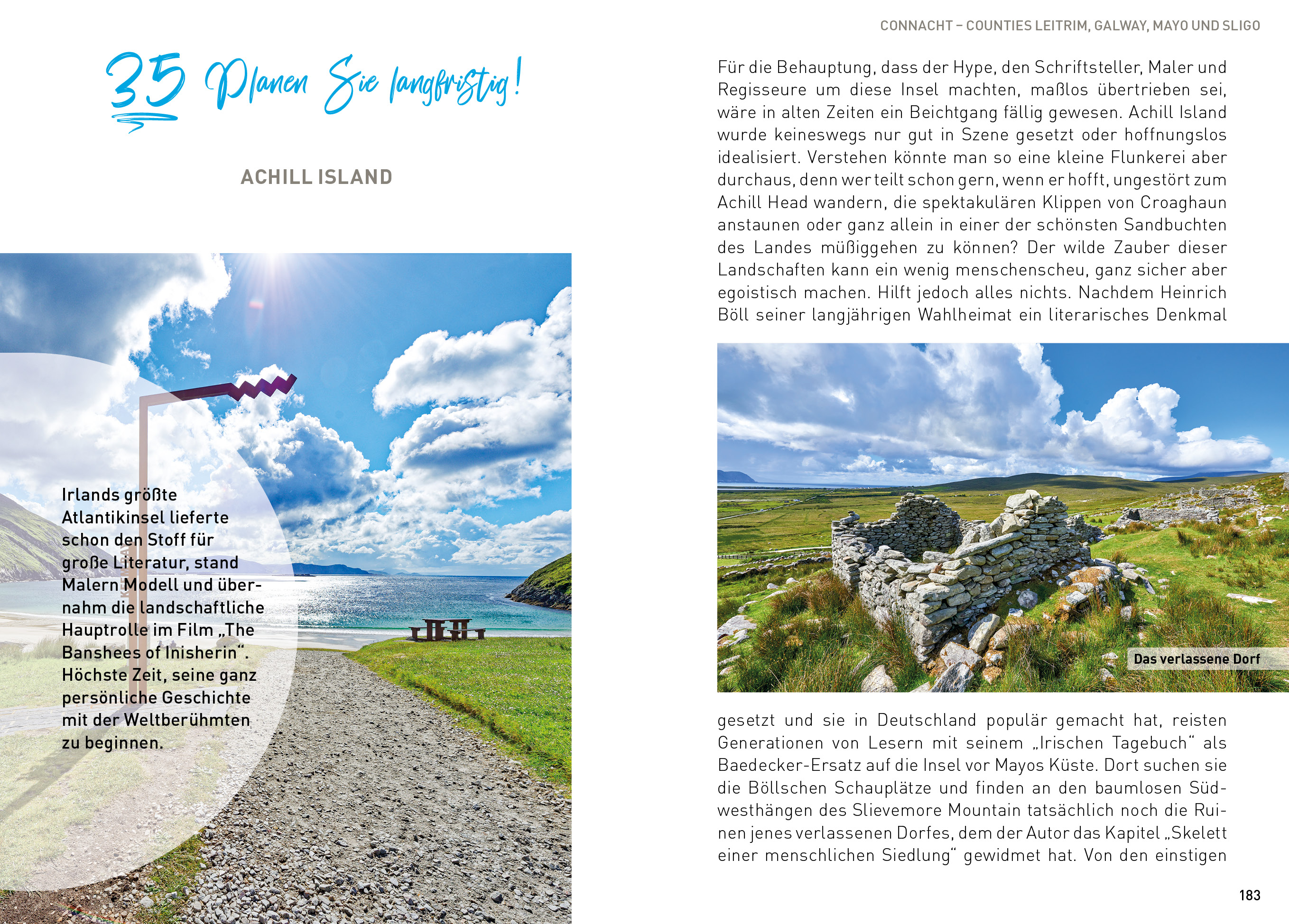 Es gibt Namen, mit denen man hexen oder heilen kann, manchmal sogar beides. Irland ist so ein magischer Name. Sein Klang zaubert Erinnerungen an windumsauste Steilklippen, quietschnasse Wiesen und sonnenbadende Robben herbei. Bilder der regenbogenbunten Insel im Herzen sind die beste Medizin, um die heimischen Alltagsärgernisse besser auf Abstand zu halten. Das Land am westlichen Ende Europas hat ein ungeheures Talent, sagenhaft schön zu sein. Es wird von Menschen bewohnt, die musikalisch aufs Angenehmste auffällig werden und hortet kulturelle, kulinarische und historische Schätze in titanischen Mengen.Weil dieses Buch aber keine biblischen Dimensionen annehmen sollte, mussten aus der Überfülle möglicher Mikroabenteuer 50 ausgewählt werden. Das Ergebnis ist die Grüne Insel im Konzentrat, und das hat es in sich: Erst wohnen wie ein Wikinger und dann das Leben als Leuchtturmwärter testen, genialen Gärtnern in die Beete gucken, in Algen aalen, Käsemacher und Austernzüchter besuchen, versteckte Klöster finden, zur Teatime nach Dublin und zur Titanic nach Belfast fahren und danach zum Insel-Eremit werden - so gibt man sich die volle Dosis Irland.