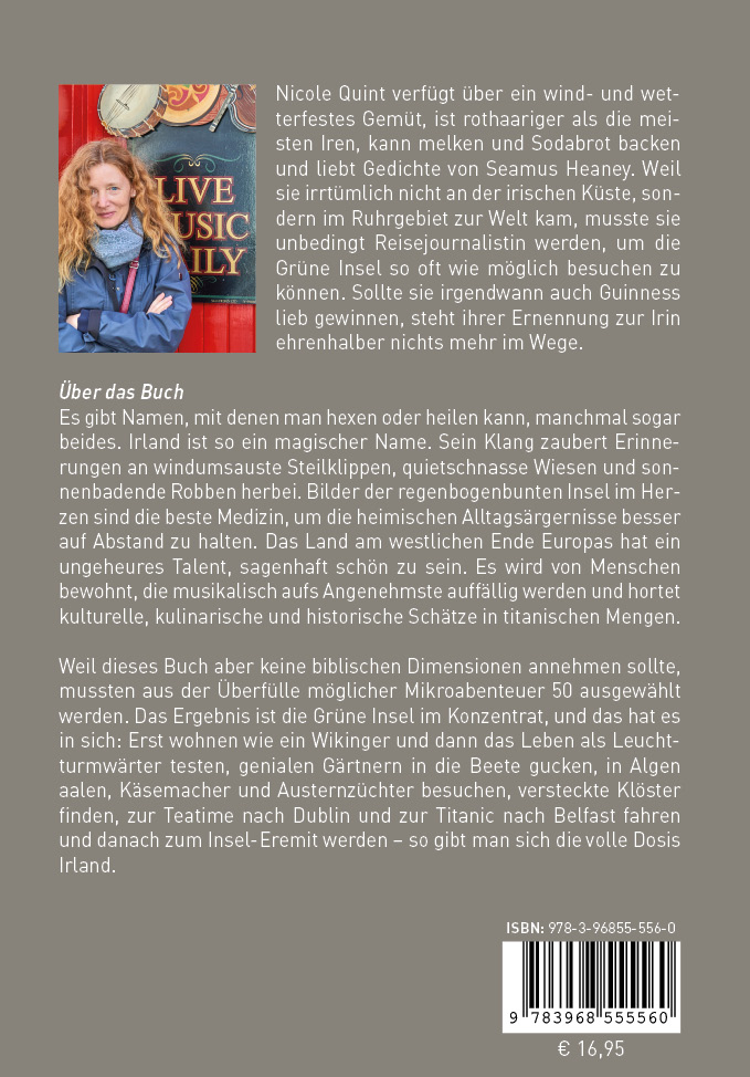 Nicole Quint verfügt über ein wind- und wetterfestes Gemüt, ist rothaariger als die meisten Iren, kann melken und Sodabrot backen und liebt Gedichte von Seamus Heaney. Weil sie irrtümlich nicht an der irischen Küste, sondern im Ruhrgebiet zur Welt kam, musste sie unbedingt Reisejournalistin werden, um die Grüne Insel so oft wie möglich besuchen zu können. Sollte sie irgendwann auch Guinness lieb gewinnen, steht ihrer Ernennung zur Irin ehrenhalber nichts mehr im Wege.