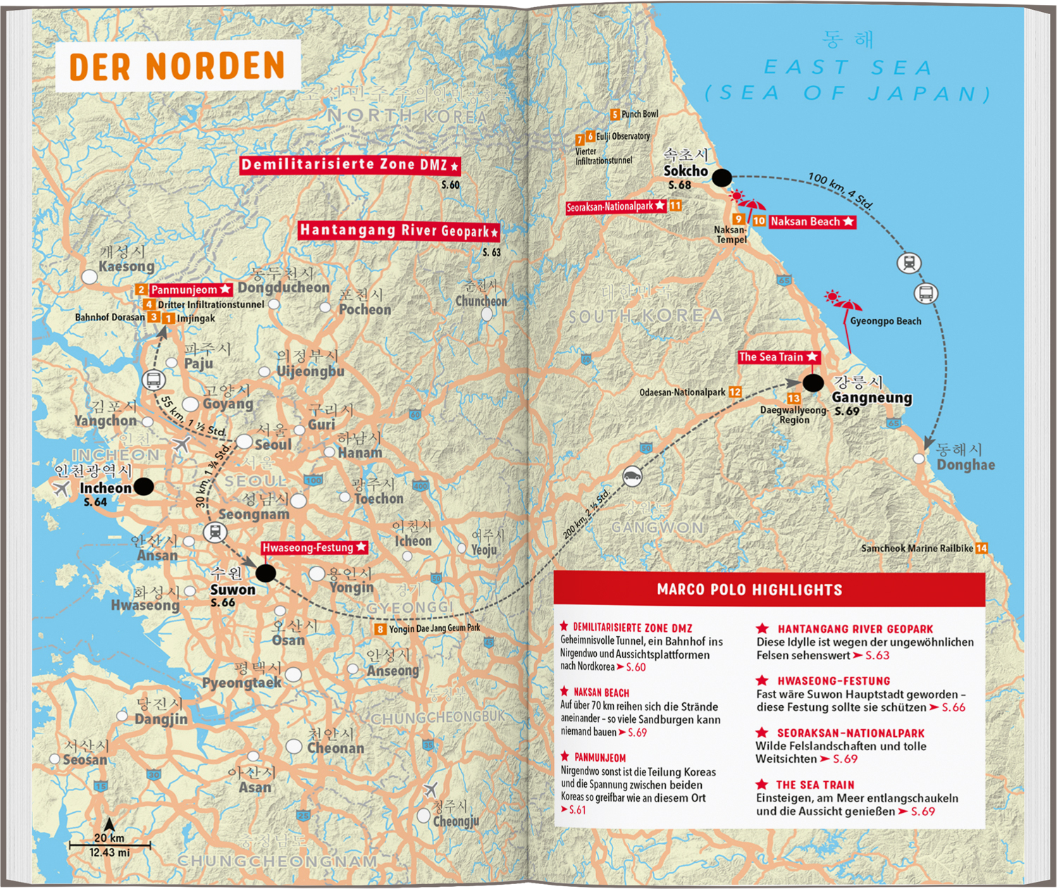 HAST DU LUST, EIN LAND DER GEGENSÄTZE zu entdecken, dich auf die Spuren von K-Pop und Hallyu zu begeben, in einsamen Berglandschaften zu wandern, buddhistische Tempel zu besuchen und wenige Stunden per Hochgeschwindigkeitszug später glitzernde Großstädte mit grandioser Skyline zu entdecken? Oder in einer der vielen riesigen Jjimjilbang-Saunalandschaften zu schwitzen? Mit dem MARCO POLO Reiseführer Südkorea besuchst du die am besten bewachte Grenze der Welt, probierst Dutzende Varianten von Kimchi, grillst dein Bulgogi selbst am Tisch und tauchst danach ins rauschende Nachtleben ein.