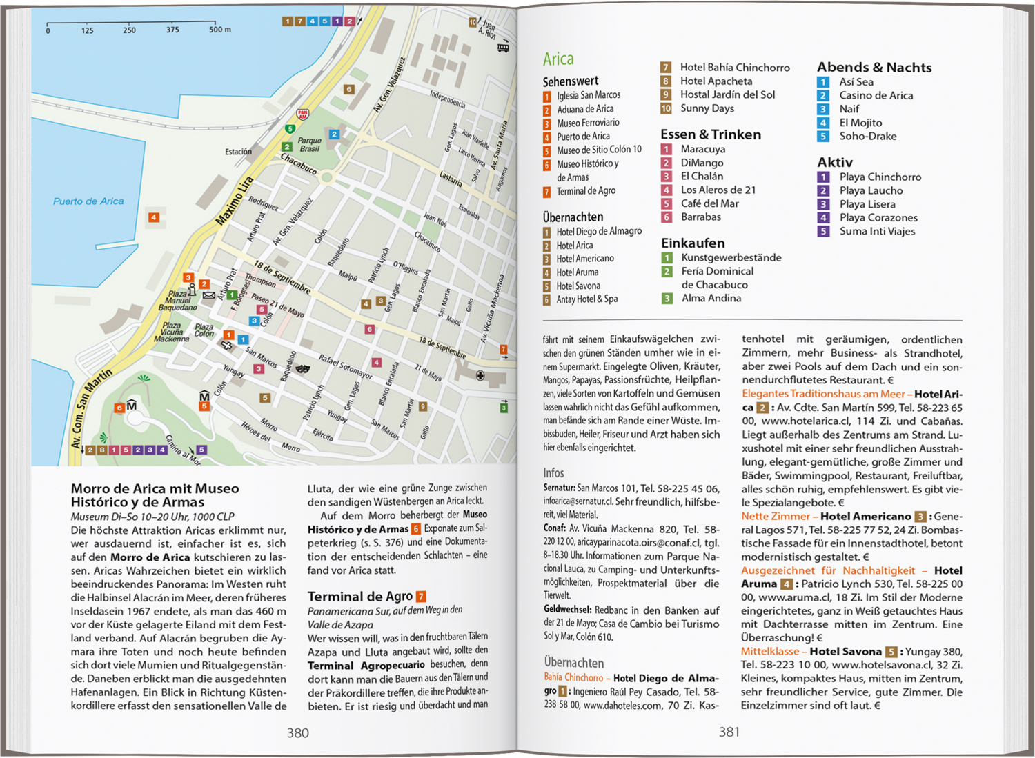 - 46 Karten und Pläne plus eine separate Reisekarte zu Chile und die Osterinsel im Maßstab 1:1.800.000.