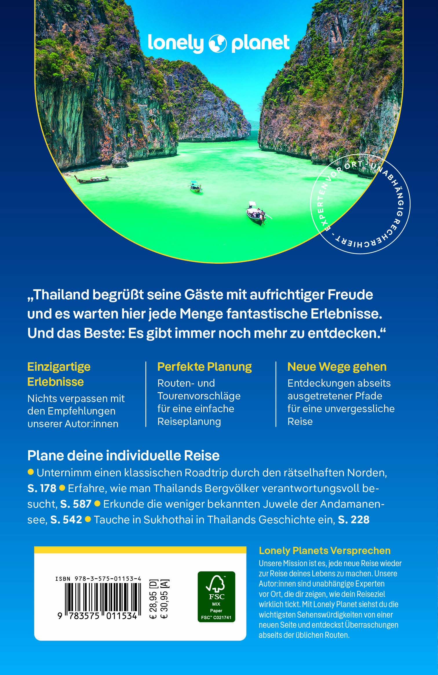 Etliche Monate Recherche stecken im Kultreiseführer für Individualreisende. Autoren geben sachkundige Hintergrundinfos zum Reiseland, liefern Tipps und Infos für die Planung der Reise, beschreiben alle interessanten Sehenswürdigkeiten und präsentieren ihre persönlichen Entdeckungen und Tipps. Und auch Globetrotter, die abseits derausgetretenen Touristenpfade unterwegs sein möchten, kommen auf ihre Kosten. Unberührte Strände mit einer atemberaubenden Unterwasserwelt, prächtige Tempel, abgelegene Nationalparks, ursprüngliche Monsunwälder,Kajakrouten, Schnäppchen-Märkte und Festivals. Der Lonely-Planet-Reiseführer Thailand ist ehrlich, praktisch, witzig geschrieben und liefert inspirierende Eindrücke und Erfahrungen.