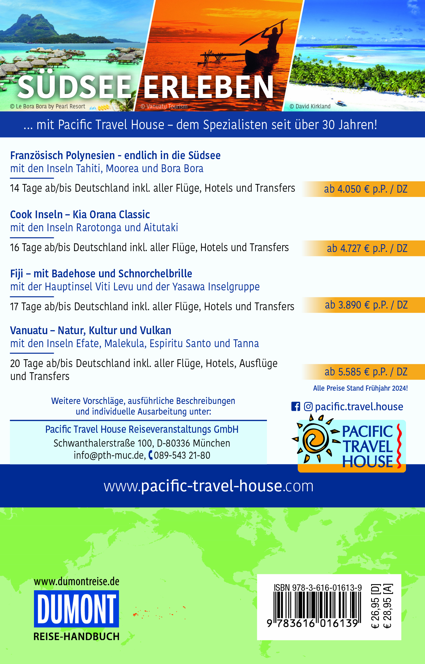 In der Südsee locken nicht nur Badestrände und sonniges Wetter. Der umfangreiche DuMont Reiseführer vermittelt Ihnen alles, was es über die weit verstreuten Inseln im Pazifik zu wissen gibt. Mit Fidschi, Tonga und Samoa, den Cook-Inseln und Französisch-Polynesien stellen die Autorinnen Franziska Grötsch und Rosemarie Schyma die Big Five der faszinierenden Inselwelt vor. Wählen Sie aus zahlreichen Tipps für Ausflüge und Unternehmungen die besten Ziele für sich aus oder folgen Sie den praktischen Tourenvorschlägen für Rundreisen. Ob Sie auf 'Upulo mit den Goldfischen im Lake Lanoto'o schwimmen oder auf den Marquesas-Inseln einen der höchsten Wasserfälle der Welt bestaunen - mit dem DuMont Reise-Handbuch erleben Sie Südsee-Abenteuer, die in Erinnerung bleiben!