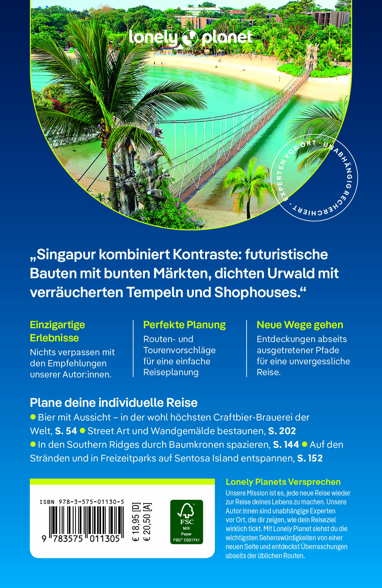 Etliche Monate Recherche stecken im Kultreiseführer für Individualreisende. Die Autoren geben sachkundige Hintergrundinfos zum Reiseland, liefern Tipps und Infos für die Planung der Reise, beschreiben alle interessanten Sehenswürdigkeiten und präsentieren ihre persönlichen Entdeckungen und Tipps. Erfahren Sie alles, was man wissen muss über die Gardens by the Bay und Singapurs Zoo, die Orchard Road und Little India. Machen Sie einen Ausflug in das Naturschutzgebiet Bukit Timah oder umrunden Sie die Insel Pulau Ubin mit einem Fahrrad, besuchen Sie das weltweit größte Aquarium oder das Indian Heritage Centre mit einer Ausstellung über das indische Kulturerbe. Und dann ist da noch das Essen: ein überwältigendes Angebot, köstlich und preiswert. Von typischen Gerichten in Garküchen bis hin zu superschicken Speisetempel. Der Lonely-Planet- Reiseführer Singapur ist ehrlich, praktisch, witzig geschrieben und liefert inspirierende Eindrücke und Erfahrungen. Ob Backpacker, Pauschalreisender oder 5-Sterne-Tourist - mit dem Lonely Planet im Rucksack sind Sie bestens gerüstet.