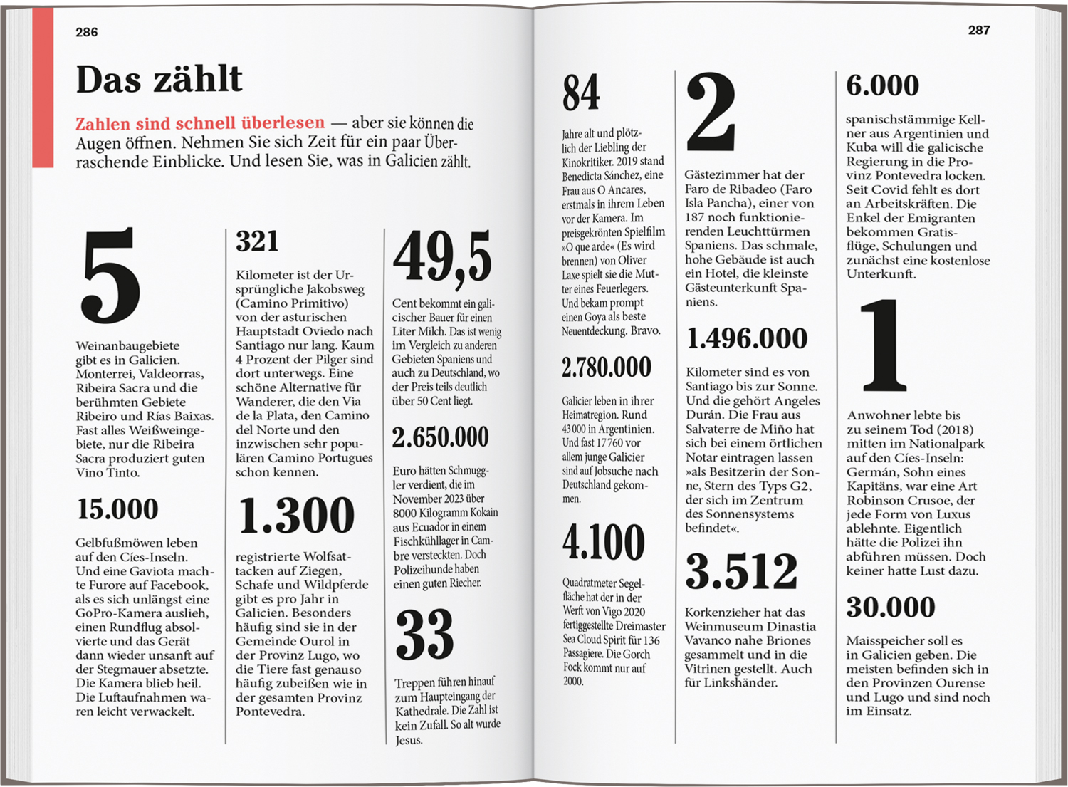 Senkrechtstarter, Überflieger, Querfeldein. Vor Ort - die Kapitel: Von den Pyrenäen bis Burgos, Von Frómista bis Santiago, Santiago de Compostela, Galiciens Nordküste, Galiciens Westküste, Galiciens Inland (Reiseinfos von A bis Z). Das Magazin. Offene Fragen.
