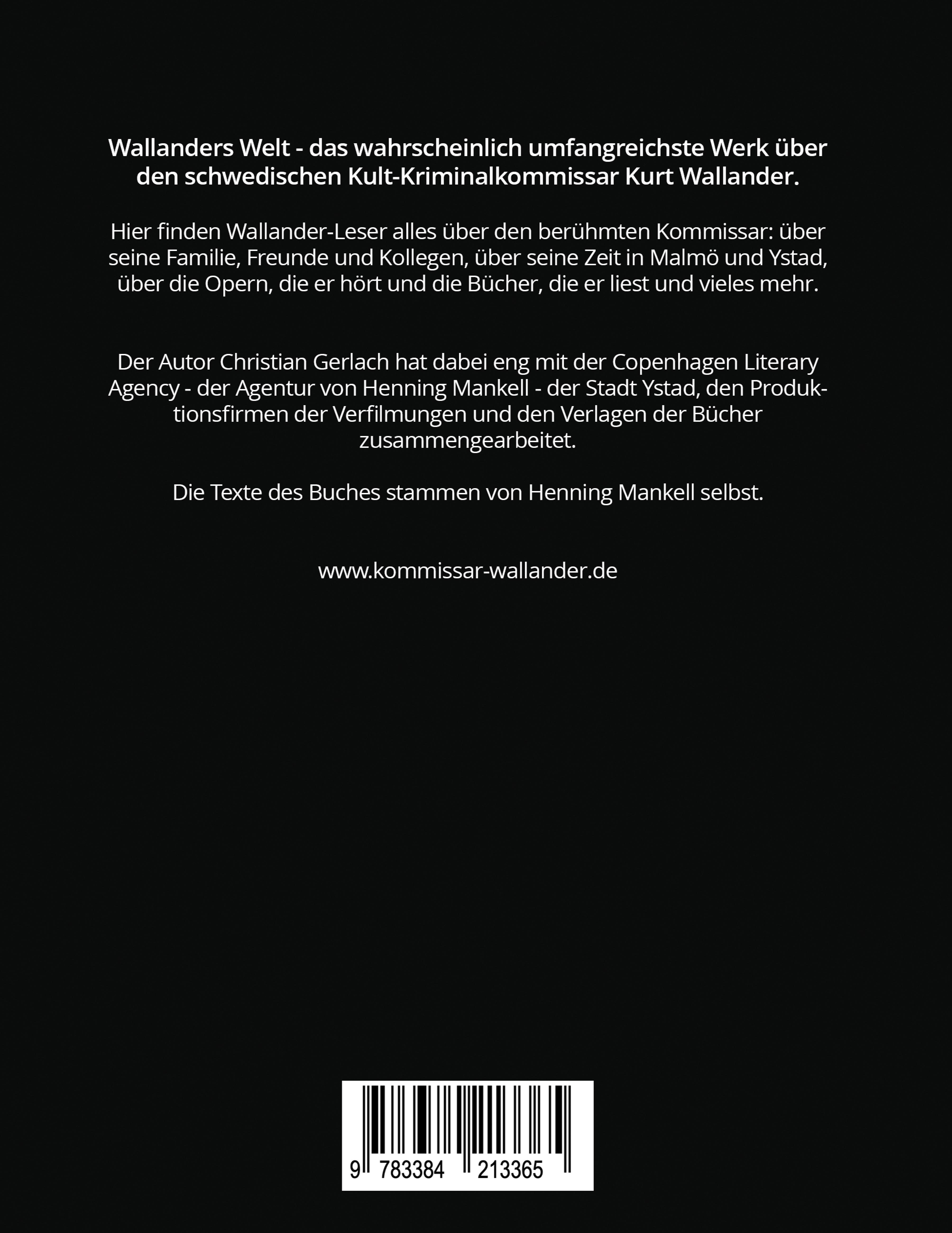 Wallanders Welt - das wahrscheinlich umfangreichste Werk über den schwedischen Kult-Kriminalkommissar Kurt Wallander. Hier finden Wallander-Leser alles über den berühmten Kommissar: über seine Familie, Freunde und Kollegen, über seine Zeit in Malmö und Ystad, über die Opern, die er hört und die Bücher, die er liest und vieles mehr. Der Autor Christian Gerlach hat dabei eng mit der Copenhagen Literary Agency - der Agentur von Henning Mankell - der Stadt Ystad, den Produktionsfirmen der Verfilmungen und den Verlagen der Bücher zusammengearbeitet. Die Texte des Buches stammen von Henning Mankell selbst.www.kommissar-wallander.de