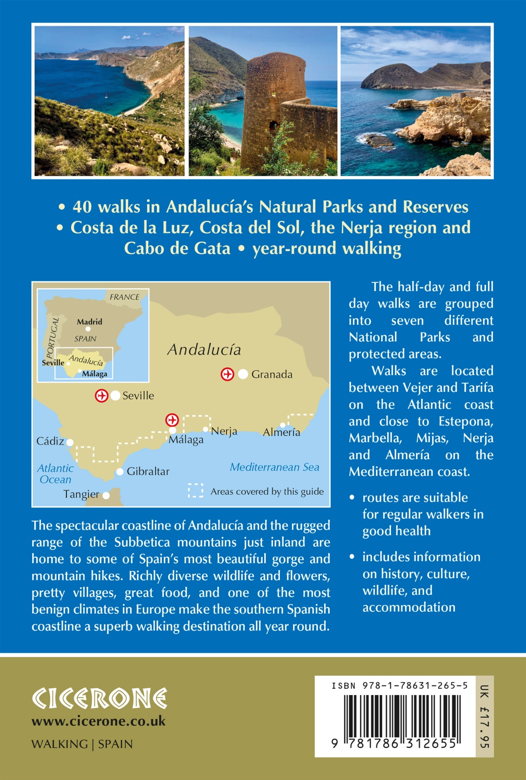Map key Overview map Route summary table Preface Introduction Seven coastal regions Plants and wildlife Andalucía over the years Getting there When to go Accommodation Eating out in southern Spain Language Money Communications What to take Maps Staying safe Using this guide 1 Costa de la Luz Parque Natural de la Breña y las Marismas Walk 1 Santa Lucía circuit Walk 2 Las Marismas de Barbate circuit Walk 3 Vejer de la Frontera southern circuit Walk 4 Los Caños de Meca circuit Walk 5 Cape Trafalgar to Conil via the Torre de Castilnovo Parque Natural de Los Alcornocales y del Estrecho Walk 6 Valdevaqueros circuit via Punta Paloma Walk 7 Río de Guadalmesí circuit Walk 8 Pelayo circuit via the Torre de Guadalmesí Walk 9 Río de la Miel circuit Walk 10 Gibraltar circuit via Mediterranean Steps 2 Costa del Sol Paraje Natural de Sierra Bermeja y Sierra Crestellina Walk 11 Manilva circuit via the Utrera Gorge Walk 12 Casares circuit via la Crestellina Walk 13 Casares eastern circuit Walk 14 Casares circuit via La Acedía Walk 15 Pico Reales circuit via El Pinsapar forest Parque Natural de la Sierra de las Nieves Walk 16 Istán circuit via the Infierno valley Walk 17 Istán to the Río Verde and back Walk 18 Istán reservoir circuit via the San Miguel chapel Walk 19 Marbella circuit via Cruz de Juanar Walk 20 Ascent of La Concha from Refugio de Juanar Walk 21 Refugio de Juanar circuit via Los Cuchillos La Sierra de Mijas Walk 22 Mijas circuit via the Pico de Mijas Walk 23 Mijas circuit via Puerto de Málaga Walk 24 Alhaurín el Grande circuit Walk 25 Alhaurín de la Torre western circuit Walk 26 Alhaurín de la Torre southern circuit Walk 27 Benalmádena circuit 3 Costa Tropical Parque Natural de la Sierra de Tejeda, Almijara y Alhama Walk 28 Ascent of La Maroma from Canillas de Aceituno Walk 29 Cómpeta circuit via Puerto Blanquillo Walk 30 Frigiliana to El Fuerte and back Walk 31 Frigiliana circuit via Cruz de Pinto Walk 32 Nerja circuit via the Río Chillar Walk 33 Maro to Frigiliana Walk 34 La Herradura circuit via Cantarriján beach 4 Costa de Almería Parque Natural de Níjar-Cabo de Gata Walk 35 San José circuit via Monsul and Los Genoveses Walk 36 Presillas Bajas to the Majada Redonda and back Walk 37 Los Escullos circuit via San José Walk 38 Rodalquilar circuit via Cortijo del Fraile Walk 39 Las Negras circuit via El Playazo Walk 40 Agua Amarga to Las Negras Appendix A Useful contacts Appendix B Accommodation Appendix C Glossary Appendix D Further reading