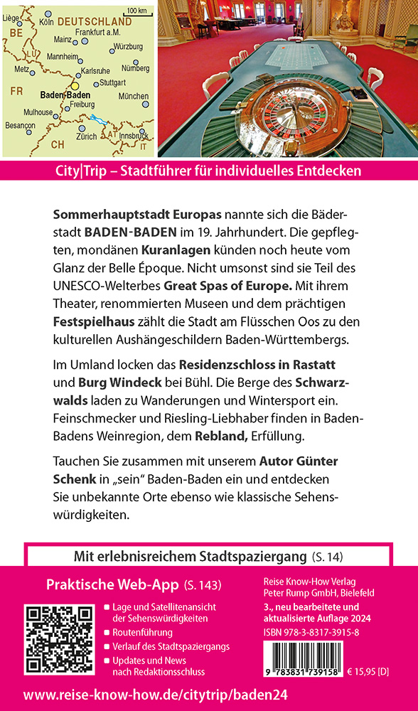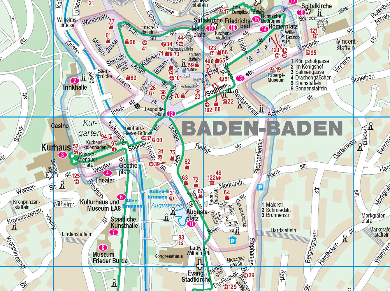 | Schlagworte | Baden • Baden-Württemberg • Bühl • Caracalla Therme • Casino • City-Guide • City-Trip • Festspielhaus • Friedrichsbad • Heidelberg • Kurhaus • Oos • Panoramaweg • Rastatt • Reiseführer • Reiseführer Baden-Baden • Schloss Favorite • Schwarzwald • Stadtführer • Stadtplan • Sybilla Augusta • Thermalbäder |
