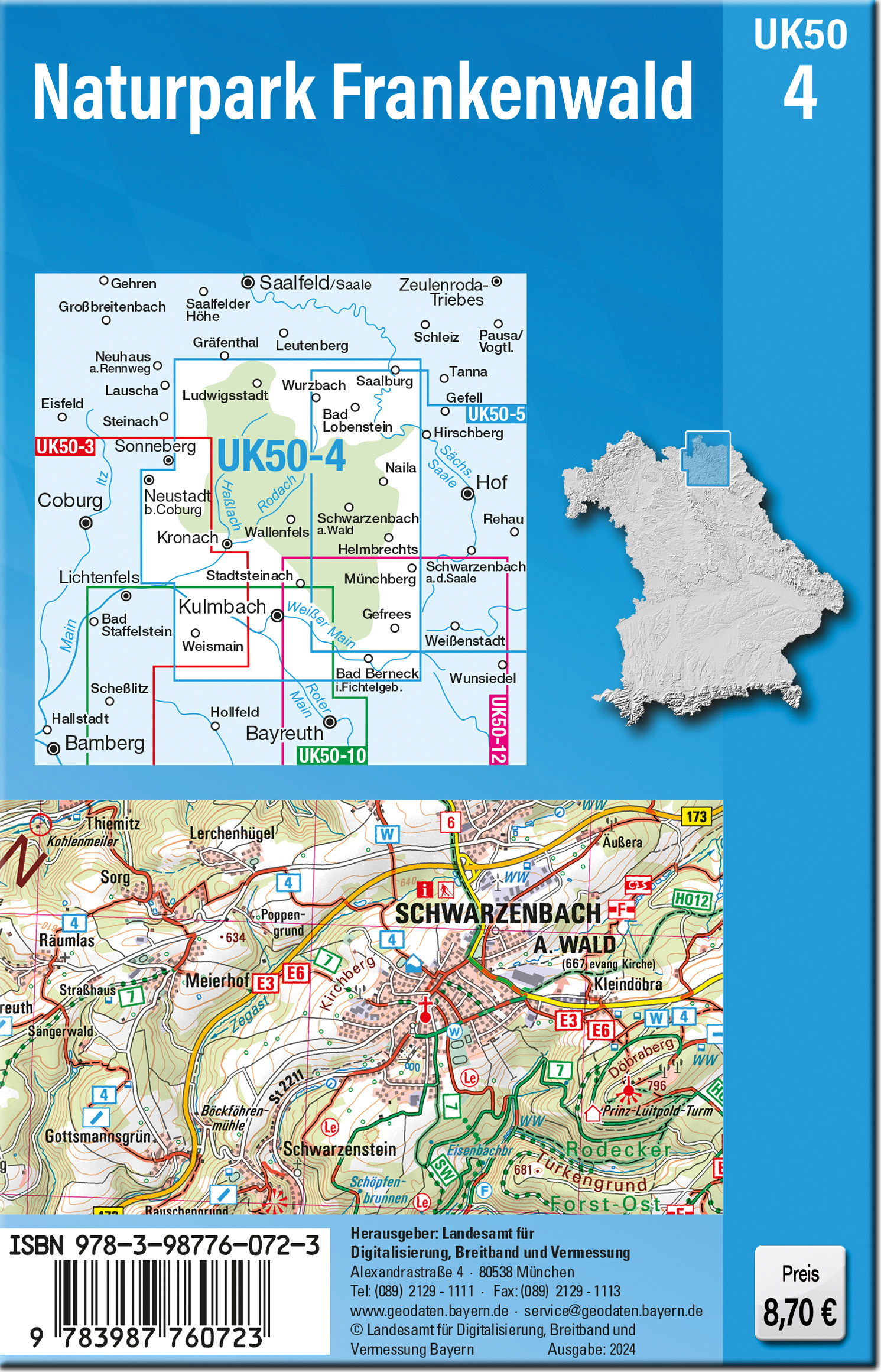 Die amtliche Reihe der UK50 (Umgebungskarte 1:50000) bietet für zusammenhängende bayerische Regionen gezielte Freizeitinformationen.Kartengrundlage ist die TK50 (Topographische Karte 1:50000) mit UTM-Gitter für GPS-Nutzer und Geländedarstellung.Der gesamte Naturpark Frankenwald, welcher auch als die "Grüne Krone Bayerns" bekannt ist, wird durch die Umgebungskarte UK50-4 präsentiert. Das Kartenbild erstreckt sich von Neustadt b.Coburg im Osten bis nach Bad Berneck i.Fichtelgebirge im Westen. Im Norden wird das angrenzende Gebiet in Thüringen mit Bad Lobenstein und dem Bleilochstausee, Deutschlands größtem Stausee, abgebildet.Radfahrer erkunden die vielseitige Landschaft auf dem Rennsteig-Radweg. Der Mainradweg führt im Frankenwald durch die Bierstadt Kulmbach und vorbei an der Wiege des Mains - dem Zusammenfluss von rotem und weißem Main bei Schloss Steinenhausen. Schöne Tagestouren bieten sich rund um Kronach und Kulmbach an. Dabei können einige sehenswerte Burgen besucht werden wie die Festung Rosenberg und die Burg Lauenstein. Wanderer können auf dem 243km langen FrankenwaldSteig den Naturpark in seiner ganzen Vielfalt erkunden. Der Weg führt z.B. an der Steinachklamm bei Wildenstein vorbei. Mit zwei verschiedenen Routen verläuft der Burgenweg von Lauenstein am nördlichsten Ende des Frankenwaldes über die Festung Rosenberg und dem Wasserschloss Mitwitz zur Plassenburg in Kulmbach. Touren durch das Kremnitztal bei Wilhelmsthal werden so zu einem Naturerlebnis der besonderen Art.Der Frankenwald bietet vielfältige Entdeckungsmöglichkeiten abseits des Massentourismus im Herzen Deutschlands. Familien verbringen einen schönen Tag in der Bergbau-Erlebniswelt Kupferberg oder im Tiergarten Sonneberg. Unvergessliche Erinnerungen sammelt man auf einer Floßfahrt auf der wilden Rodach in Wallenfels. Badespaß bieten das Erlebnisbad Crana Mare in Kronach oder die Therme Bad Steben.Kartenblatt UK50-4 Naturpark FrankenwaldREGIONEN: Oberfranken, FrankenwaldORTE: Kulmbach, Kronach, Helmbrechts, Neustadt b.Coburg, Naila, Münchberg, Bad Lobenstein, Schwarzenbach a.Wald, Weismain, Bad Berneck, Gefrees, Saalburg