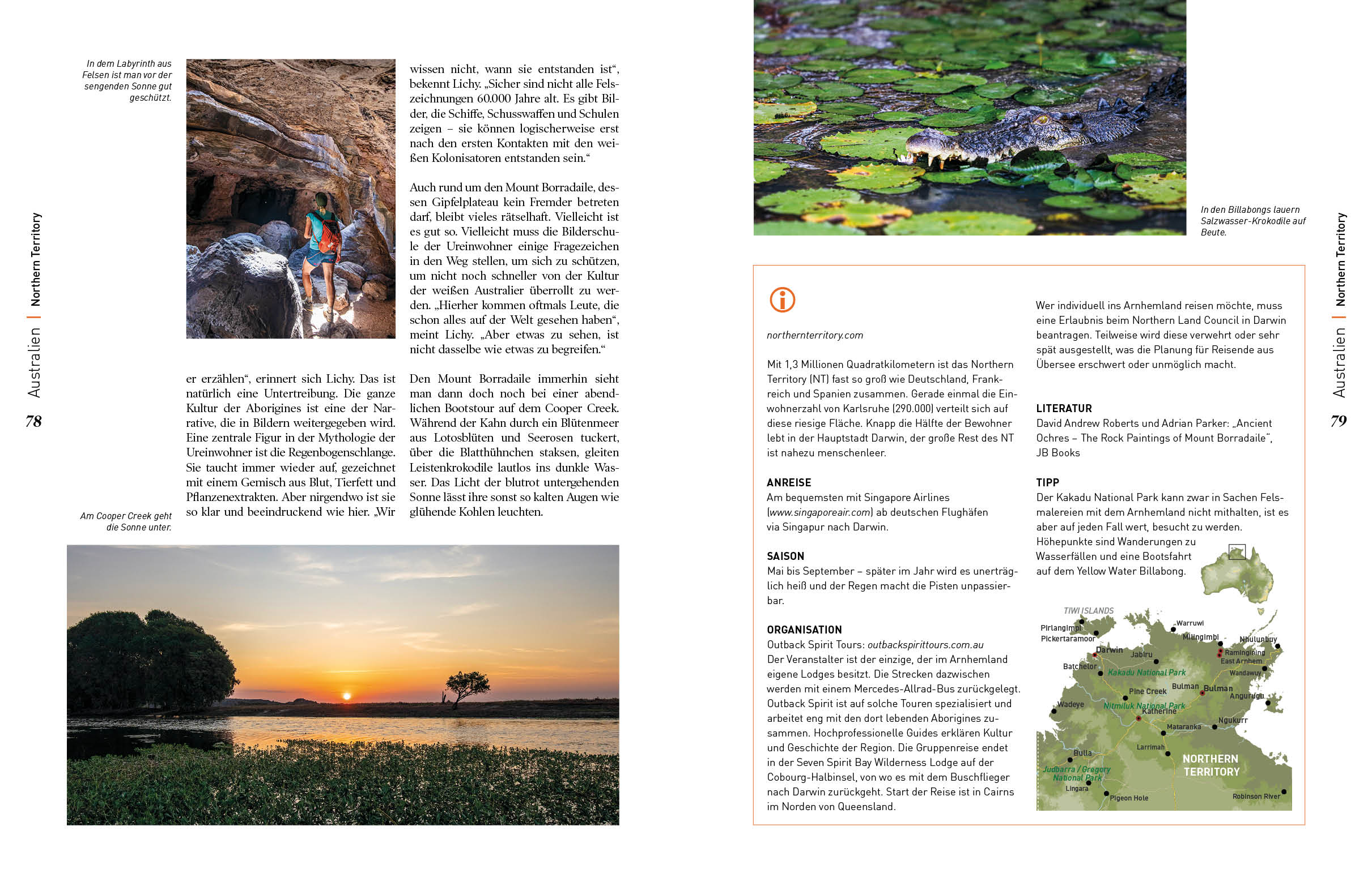 Den australischen Bundesstaat Western Australia hat Stephan Brünjes in zwei Beiträgen unter die Lupe genommen. Rund um die Küstenstadt Broome hat er mit Kamelen den Sonnenuntergang am Cable Beach genossen, Greg’s Astro Show besucht und ist in die Geschichte der Perlenfischer eingetaucht. Tief im Süden des westlichsten Bundesstaats lockt anschließend bei Esperance der weißeste Sand Australiens und der Great Ocean Drive. Abschließend entdecken wir gemeinsam mit Günter Kast ganz im Norden des Northern Territory das Arnhemland, das fast ausschließlich von Aborigines bewohnt wird.