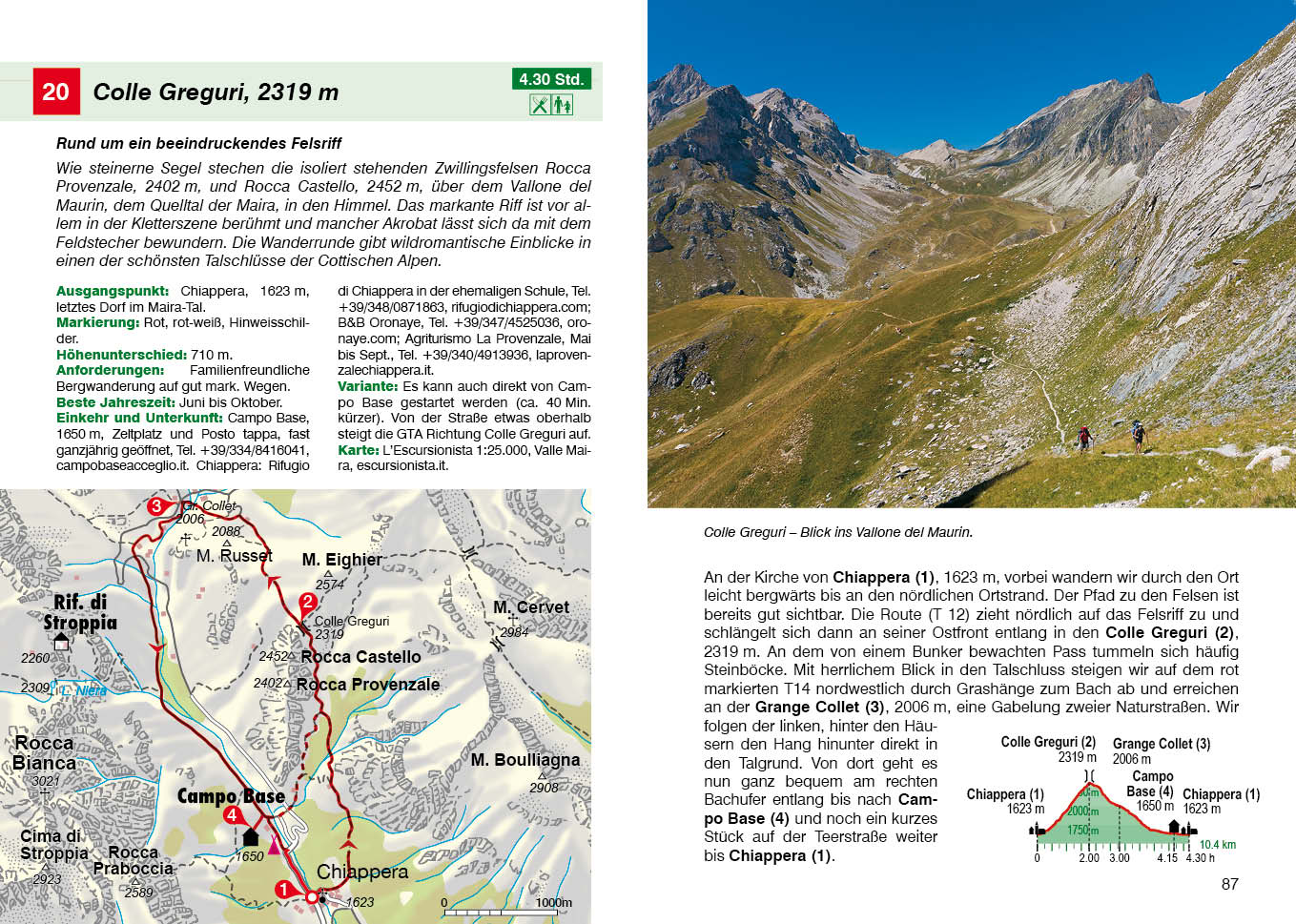Die Tourenauswahl umfasst 35 leichte bis anspruchsvolle Halbtages- und Tageswanderungen in den Cottischen Alpen, den Seealpen und den Ligurischen Alpen. Außerdem werden 15 Mehrtagestouren vorgestellt, die zwischen zwei und elf Tagen dauern. Denn die Einsamkeit und Wildheit der piemontesischen Bergwelt lässt sich auf Trekkingtouren am intensivsten erfahren.