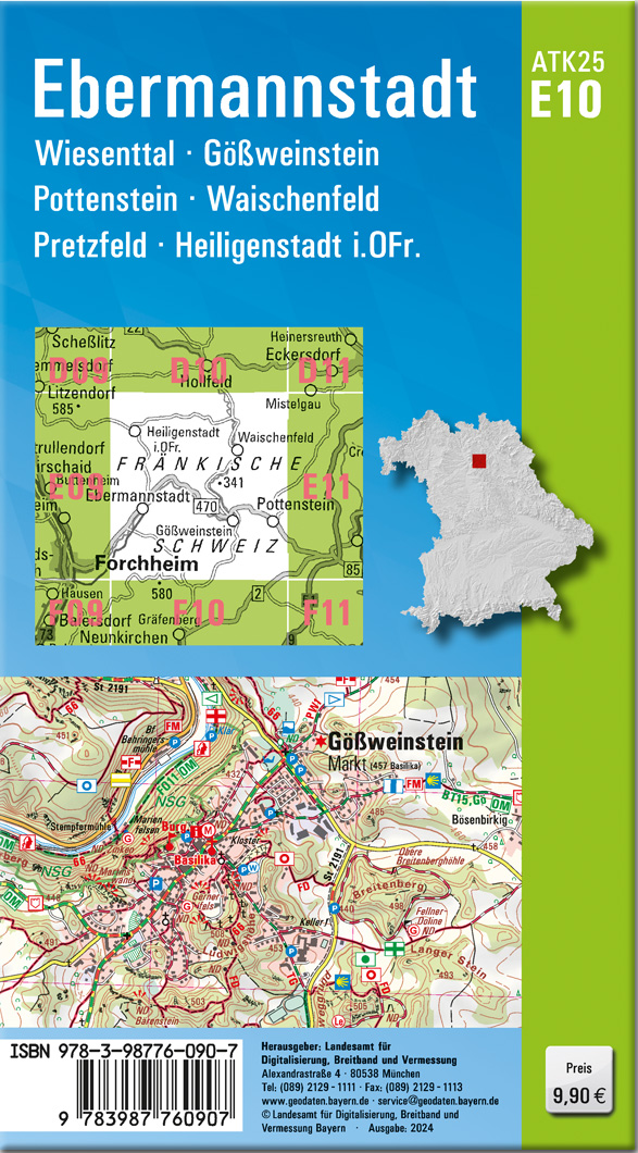 Wer es genau wissen will, greift zur ATK25. Diese Kartenserie im Maßstab 1:25000 bildet mit ihrer detaillierten Darstellung das komplette Verkehrsnetz mit allen Straßen und Wegen ab.237 Einzelblätter stellen Bayern flächendeckend dar. Ein Kartenblatt umfasst ca. 21 km x 22 km.Was bietet die ATK25?- individuelle Freizeitgestaltung mit allen ausgeschilderten Wander- und Radwanderwegen- sichere Orientierung auch abseits der markierten Routen- umfangreiches Spektrum an Freizeiteinrichtungen und Sehenswürdigkeiten- anschauliche Wiedergabe der GeländeformenKartenblatt ATK25-E10 Ebermannstadt:REGION: Oberfranken, Fränkische Schweiz, Fränkische AlbORTE: Ebermannstadt, Wiesenttal, Gößweinstein, Pottenstein, Waischenfeld, Pretzfeld, Heiligenstadt i.OFr., Aufseß, Ahorntal, Kirchehrenbach, Plankenfels
