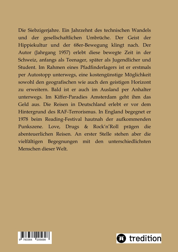 Eigentlich hatte der Autor (1957 in der Schweiz geboren) nach seinem Studienabschluss geplant, ein Jahr lang Südostasien zu bereisen und anschliessend weiter zu studieren. Doch es kommt anders: Er entdeckt, dass auch das stetige Unterwegssein Lebensinhalt sein kann und ebenso Erfüllung verspricht. Schliesslich werden es zehn Jahre, während denen der Autor vor allem Asien, aber auch Afrika und Europa bereist. Die Uni besucht er kein weiteres Mal mehr. Mit der Geburt des ersten von zwei Kindern, beginnt nach Jahren des Herumvagabundierens, ein neuer, sesshafter Lebensabschnitt mit einer regelmässigen Berufstätigkeit als Lehrer für naturwissenschaftliche Fächer. Während verschiedener Schulferien und einer halbjährigen Auszeit begibt er sich mit seiner Familie erneut auf Reisen. Der Autor lebt in der Innerschweiz und verfolgt seit seiner Frühpensionierung die verschiedensten Interessen und Projekte. Künstlerisches steht im Vordergrund: unter anderem das Schreiben. Im vorliegenden Buch beschreibt er die bewegte Zeit der 70er-Jahre, die er erst als Teenager, später als Jugendlicher und zuletzt als Student erlebt hat.