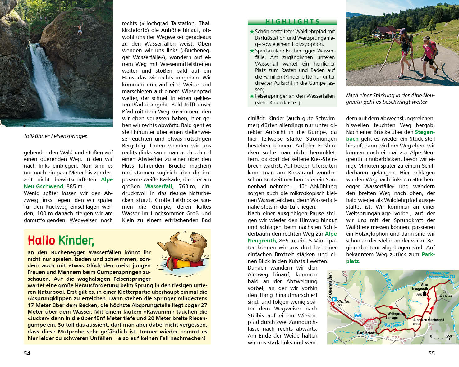 Die 30 Wandervorschläge in diesem Buch haben alle ein besonderes Highlight für Kinder zu bieten, sei es einen Klammweg, einen für Kinder geeigneten Klettersteig oder zahme Tiere auf der Alp. Oft lässt sich die Tour mit einem der zahlreichen Freizeitangebote im Allgäu verbinden, wie zum Beispiel mit einer rasanten Talfahrt auf der Sommerrodelbahn oder einem Besuch in der Erzgruben-Erlebniswelt. Der ergänzende Serviceteil bietet zahlreiche weitere Freizeit- und Schlechtwettertipps.