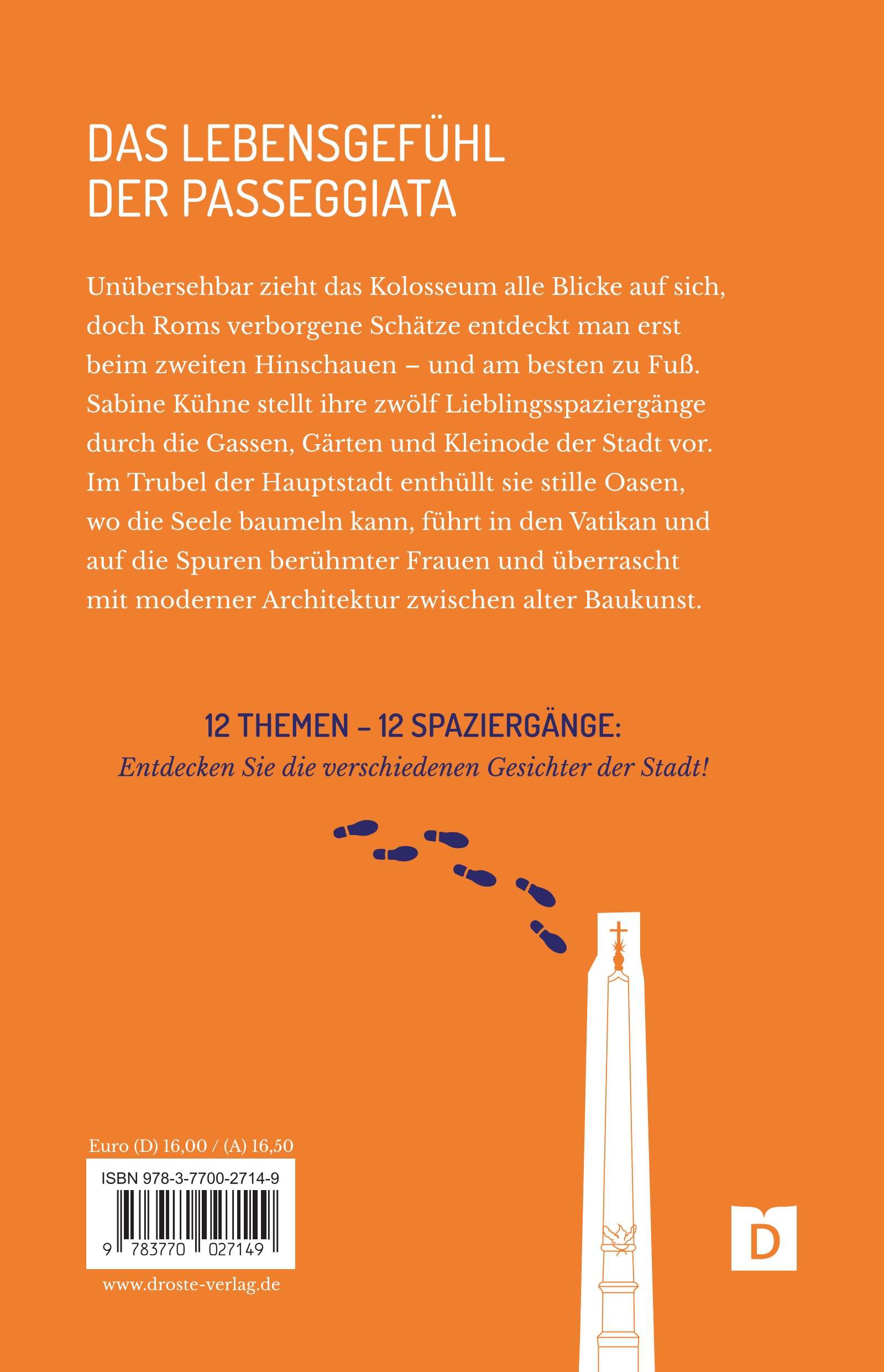 Unübersehbar zieht das Kolosseum alle Blicke auf sich, doch Roms verborgene Schätze entdeckt man erst beim zweiten Hinschauen – und am besten zu Fuß. Sabine Kühne stellt ihre zwölf Lieblingsspaziergänge vor, auf denen man in aller Ruhe durch die Gassen, Gärten und Kleinode der Stadt streift. Im Trubel der Hauptstadt enthüllt sie stille Oasen, wo die Seele baumeln kann, führt in den Vatikan und auf die Spuren berühmter Frauen und überrascht mit moderner Architektur zwischen alter Baukunst.