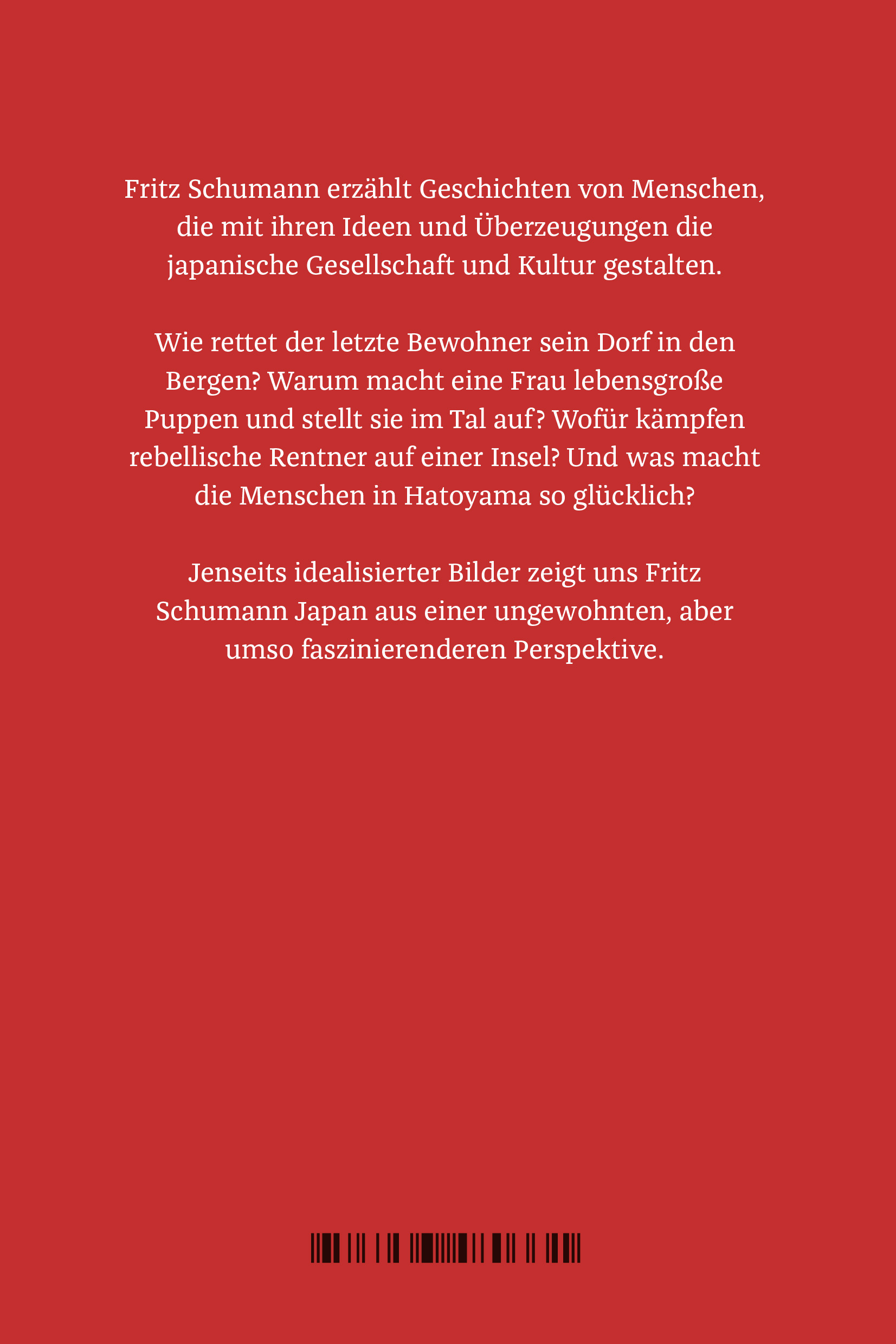 Japan ist mehr als Kirschblüten und Teezeremonien. Fritz Schumann zeigt mit seinen Japan Reiseberichten ein anderes Bild - voller unerwarteter Begegnungen und bewegender Schicksale. Er erzählt in seinem Buch über Japan Geschichten von Menschen, die mit ihren Ideen und Überzeugungen die japanische Gesellschaft und Kultur gestalten. Wie rettet der letzte Bewohner sein Dorf in den Bergen? Warum macht eine Frau lebensgroße Puppen und stellt sie im Tal auf? Wofür kämpfen rebellische Rentner auf einer Insel? Und was macht die Menschen in Hatoyama so glücklich?