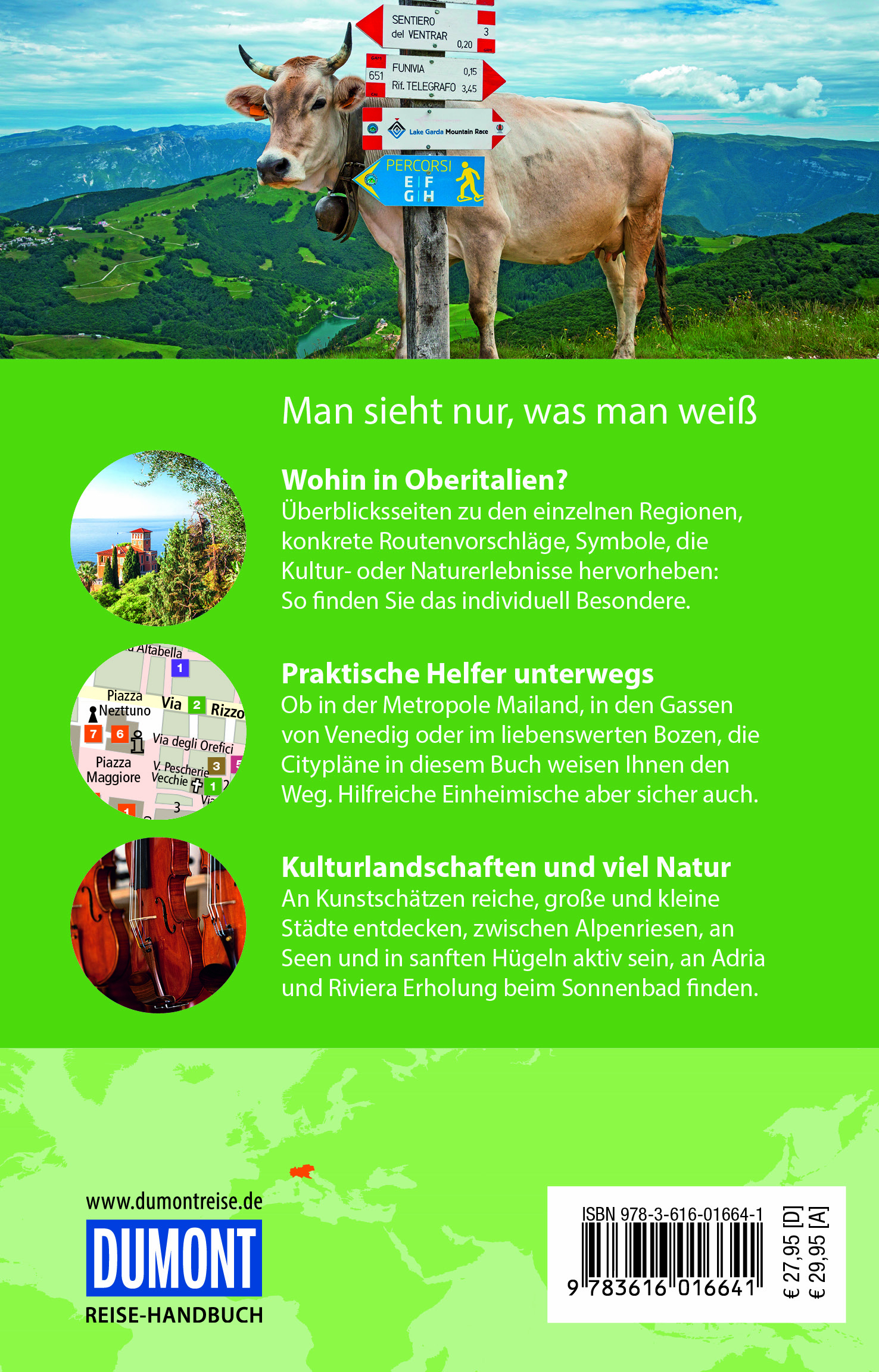 Imposante Berglandschaften und malerische Seen, artenreiche Flusstäler und berühmte Badestrände - es sind die vielgestaltigen Landschaften, die Besucher an Oberitalien faszinieren. Kunstliebhaber, Kulturbegeisterte und kulinarische Genießer kommen zwischen Turin und Triest ebenfalls auf ihre Kosten. Im DuMont Reise-Handbuch finden Sie Ziele und Aktivitäten für jeden Geschmack und erhalten auf ausführlichen Themenseiten faszinierende Einblicke in das Leben der Menschen vor Ort.