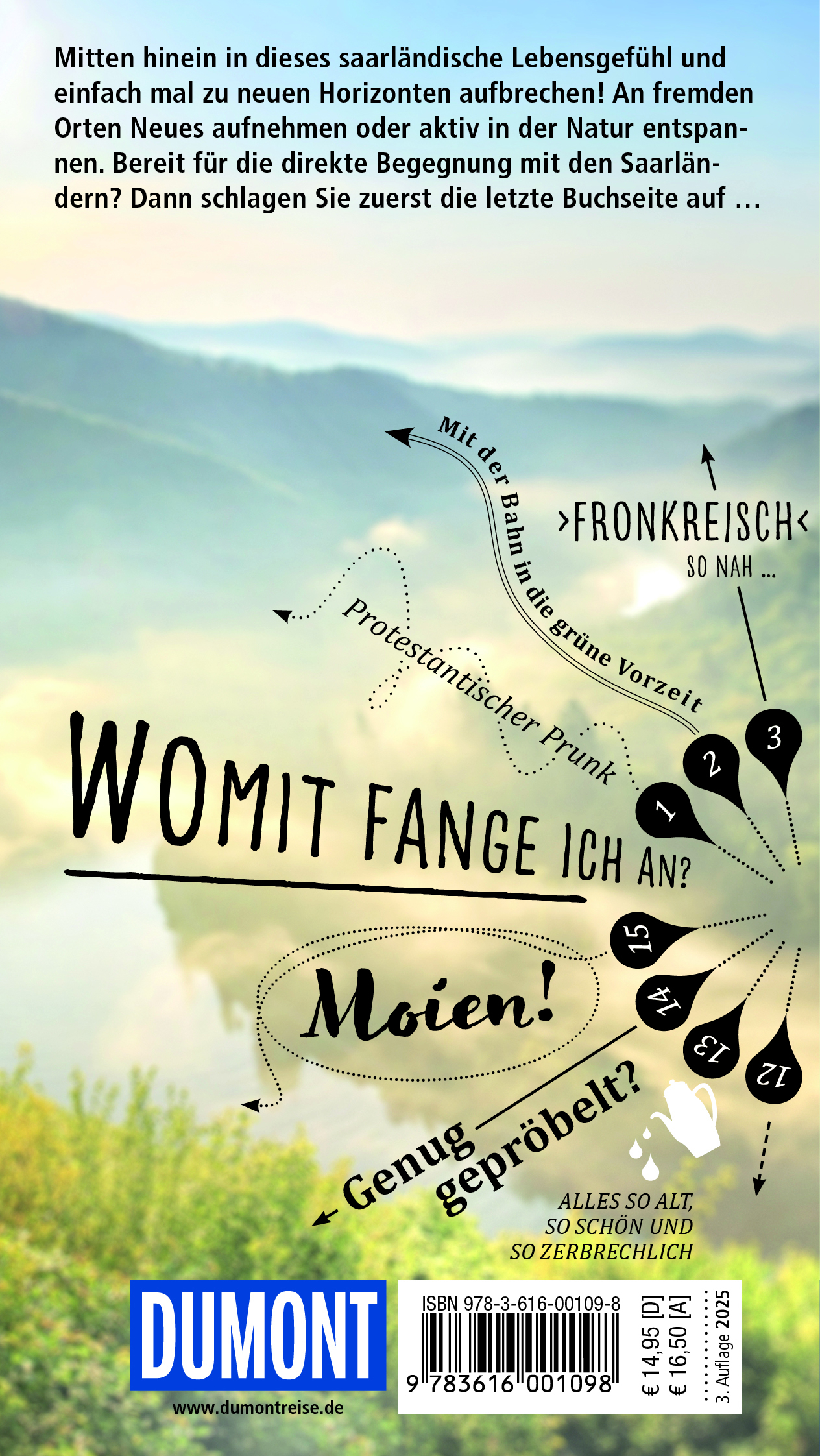 Mit den 15 »Direktkapiteln« des Reiseführers von Wolfgang Felk und Nicole Sperk können Sie sich zwanglos unter die Saarländer mischen, direkt in das Lebensgefühl im Dreiländereck eintauchen, aktiv in der Natur entspannen und die Highlights kennenlernen: Saarbrücken und den Saar-Urwald, Stätten aus keltisch-römischer Zeit, die Völklinger Hütte und die Abtei Tholey, Gartenkultur und Weinbau im Grenzland, das Tal der Blies und die Festungsstadt Saarlouis.