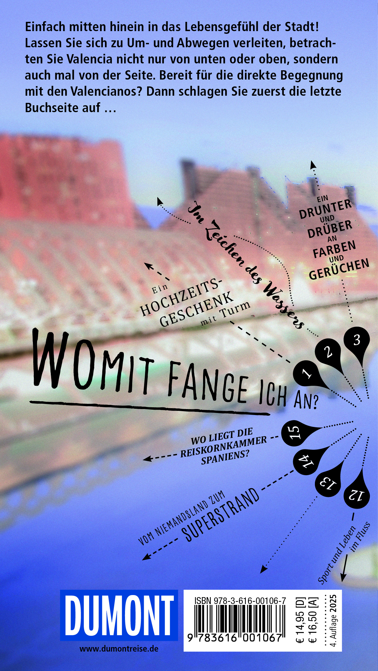 Mit den 15 »Direktkapiteln« des Reiseführers von Daniel Izquierdo Hänni können Sie sich zwanglos unter die Valencianos mischen, direkt in das Stadtleben eintauchen und die Highlights und Hotspots kennenlernen: die historische Altstadt El Carmen mit quirligen Plätzen und Gassen, den Mercado Central und die alte Seidenbörse, spannende Museen und neue Trendviertel, pompöse Prachtbauten, Modernes vom Stararchitekten und das maurische Erbe.