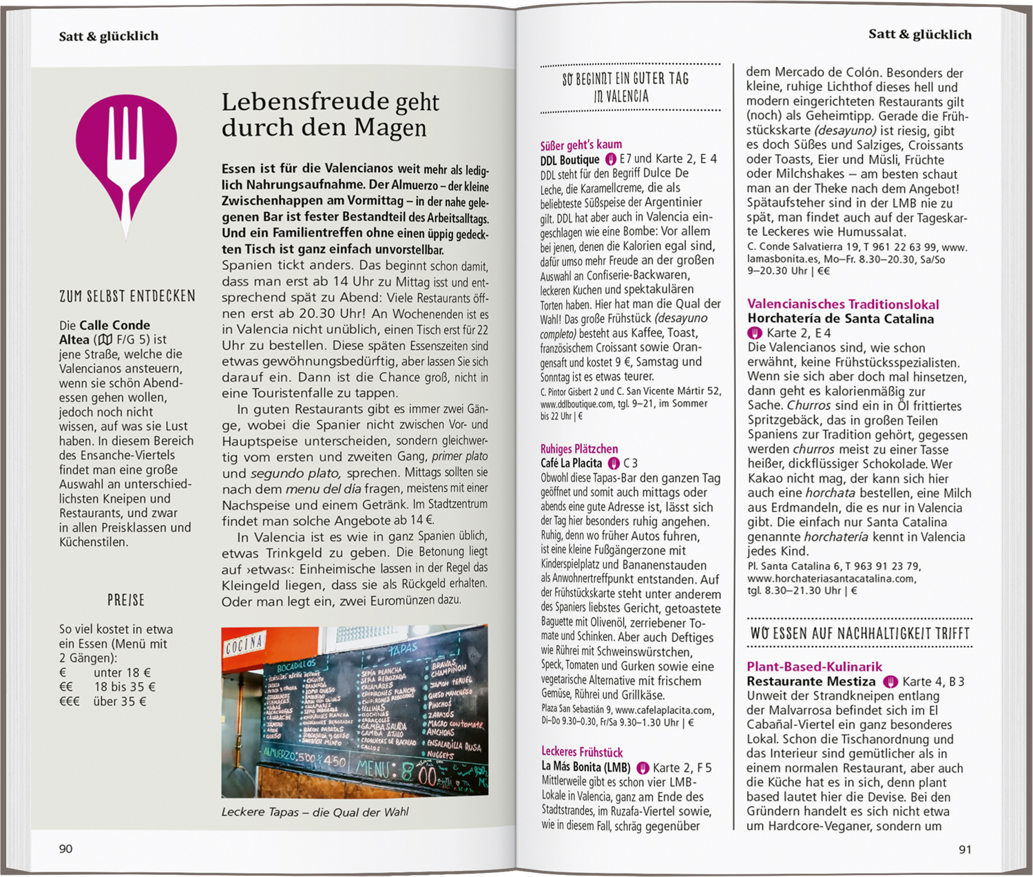 In eigenen Kapiteln erfahren Sie, wo es sich in fremden Betten gut schläft, wo Sie glücklich satt werden, wohin die Valencianos zum Stöbern und Entdecken gehen und wohin es sie zieht, wenn die Nacht beginnt.