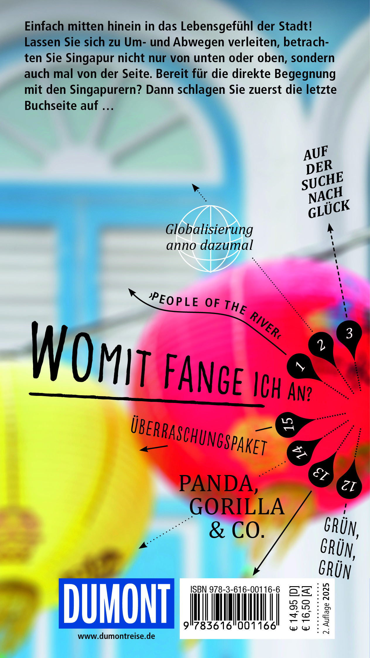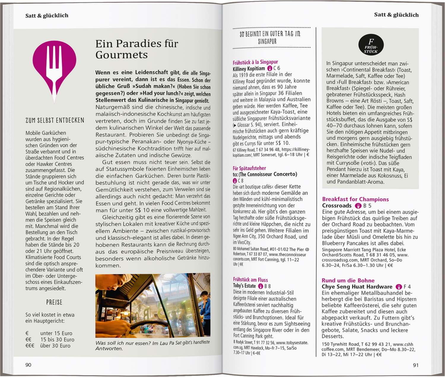 In eigenen Kapiteln erfahren Sie, wo es sich in fremden Betten gut schläft, wo Sie glücklich satt werden, wohin die Singapurer zum Stöbern und Entdecken gehen und wohin es sie zieht, wenn die Nacht beginnt.