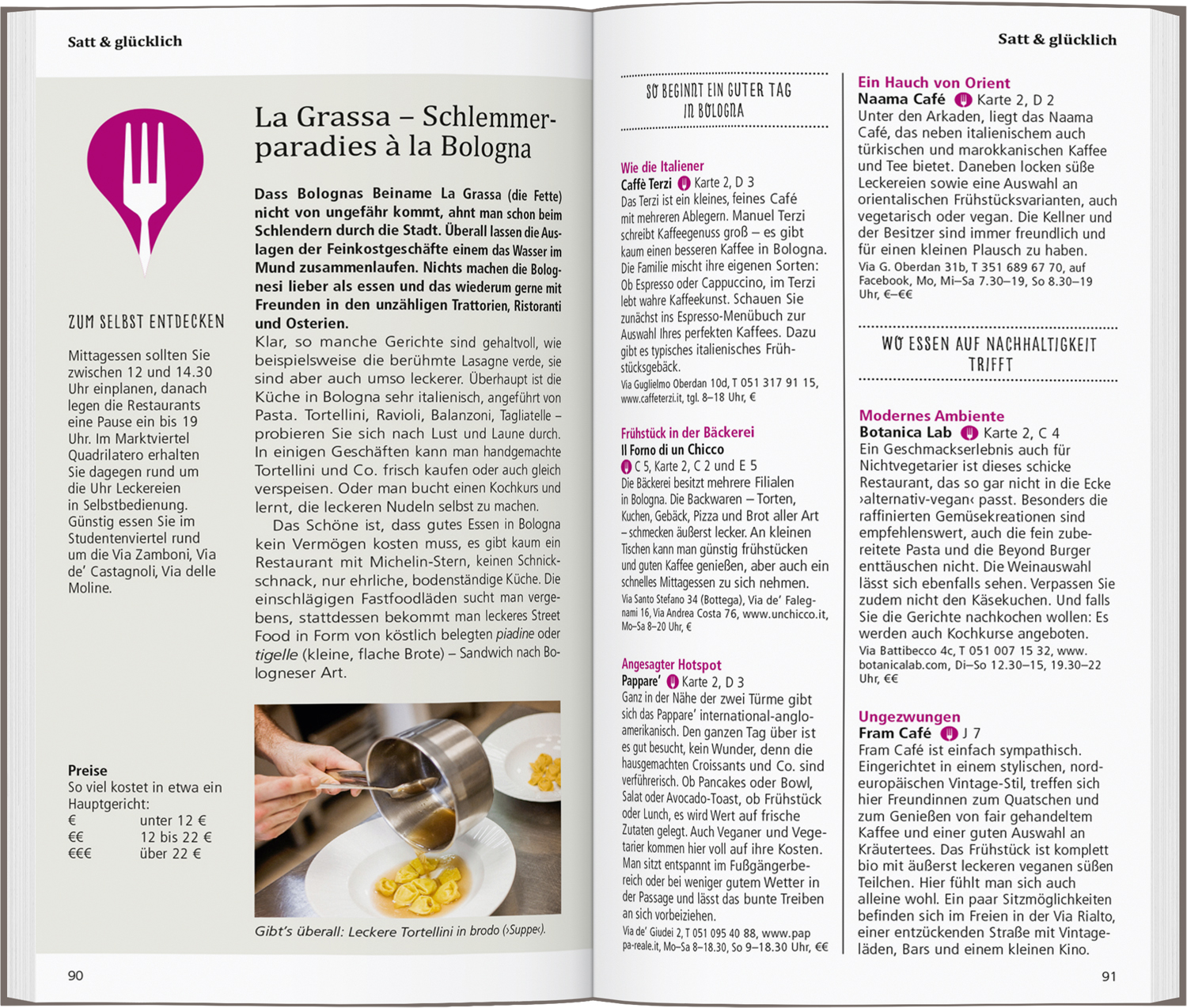 In eigenen Kapiteln erfahren Sie, wo es sich in fremden Betten gut schläft, wo Sie glücklich satt werden, wohin die Bolognesi zum Stöbern und Entdecken gehen und wohin es sie zieht, wenn die Nacht beginnt.