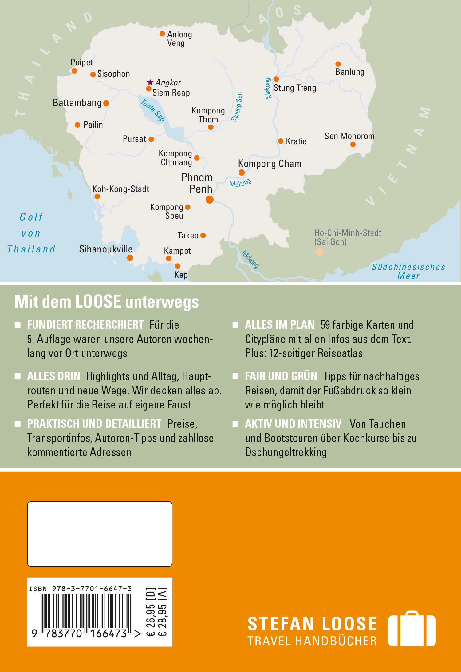 Die fünfte Auflage des Stefan Loose Reiseführers Kambodscha verspricht aktuelle und ausführliche Informationen. Die AutorInnen haben gründlich recherchiert und mit Liebe zum Detail alles Wissenswerte zusammengestellt. Die Hauptattraktionen, darunter Phnom Penh und die Tempel von Angkor, werden ausführlich vorgestellt. Doch dabei belassen es die Autoren nicht: Infos gibt es auch zu Reisezielen, die nur wenige Menschen besuchen. Wie wäre es z.B. mit einem Trip in einen entlegenen Nationalpark, der Erkundung traumhafter Sandstrände oder einem Besuch in versteckten Dörfern im Dschungel? Auf geht's in die Provinzen, in die bis heute kaum ein Tourist reist!