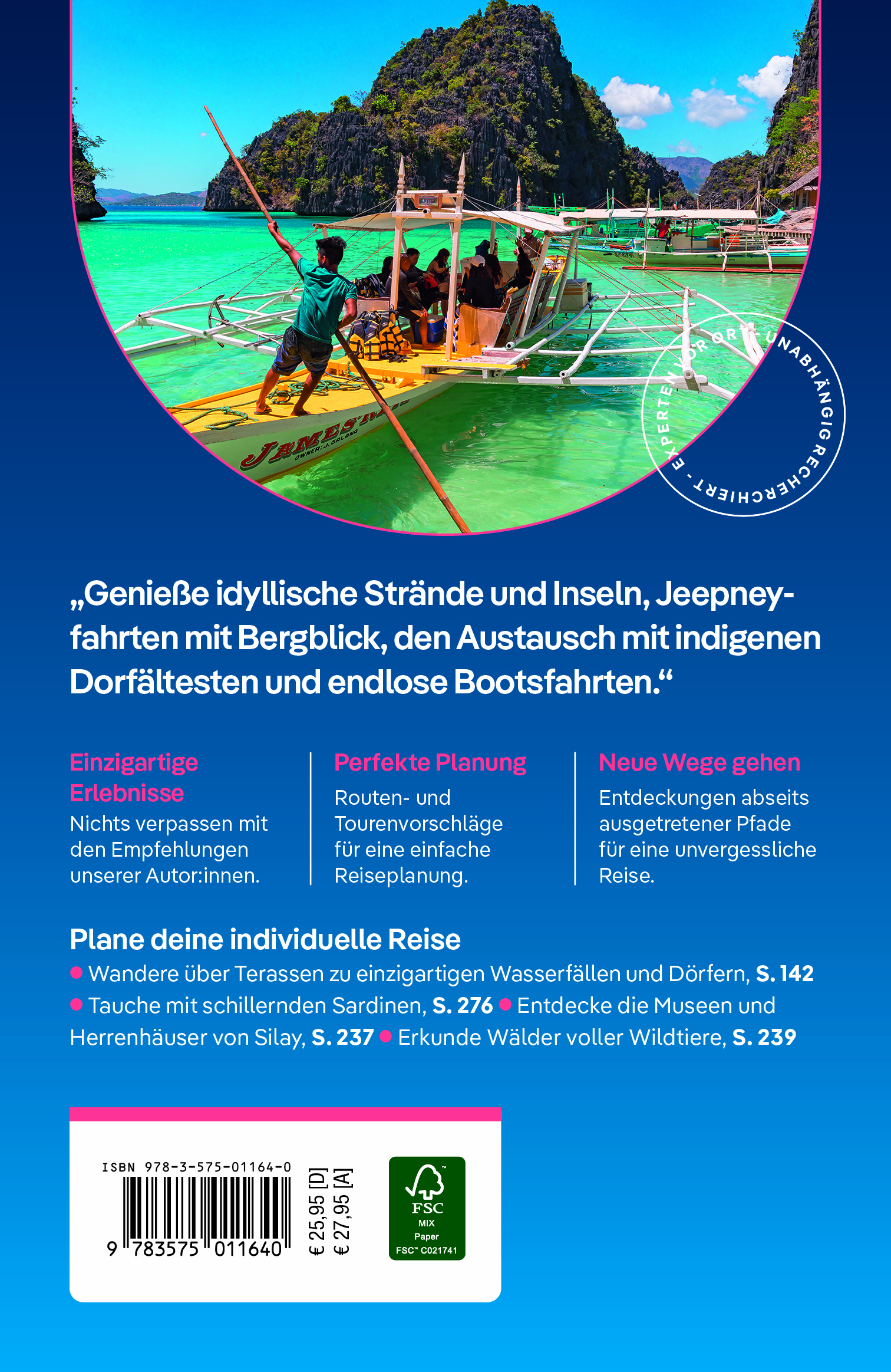 | Schlagworte | Ati-Atihan-Festival • Bacuit Archipelago • Bicol • Bohol • Boracay • Cebu • Chocolate Hills • Ifugao-Reisterrassen • Koboldmaki • Luzon • Manila • Mindanao • Mindoro • Palawan • Philippinen Reiseführer • Puerto Galera • Reiseführer Philippinen • Sagada • Siargao • Süd-Negros • Südostasien |