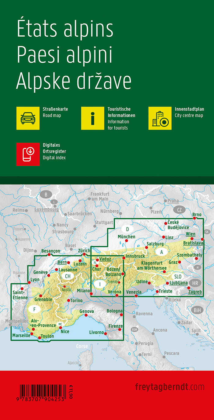 Neben der übersichtlichen Gestaltung bietet die freytag & berndt Straßenkarte "Alpenländer 1:500 000" zahlreiche Zusatzinformationen wie z.B. Straßenbeschaffenheit, Sehenswürdigkeiten, Campingplätze und diverse Innenstadtpläne.Mit dem umfangreichen Ortsregister gelingt eine rasche Orientierung.Details: Citypläne, darunter Bern, Ljubljana, Milano, München, Wien, Venezia und Zagreb. touristische Informationen, digitales Ortsregister mit Postleitzahlen, doppelseitig;