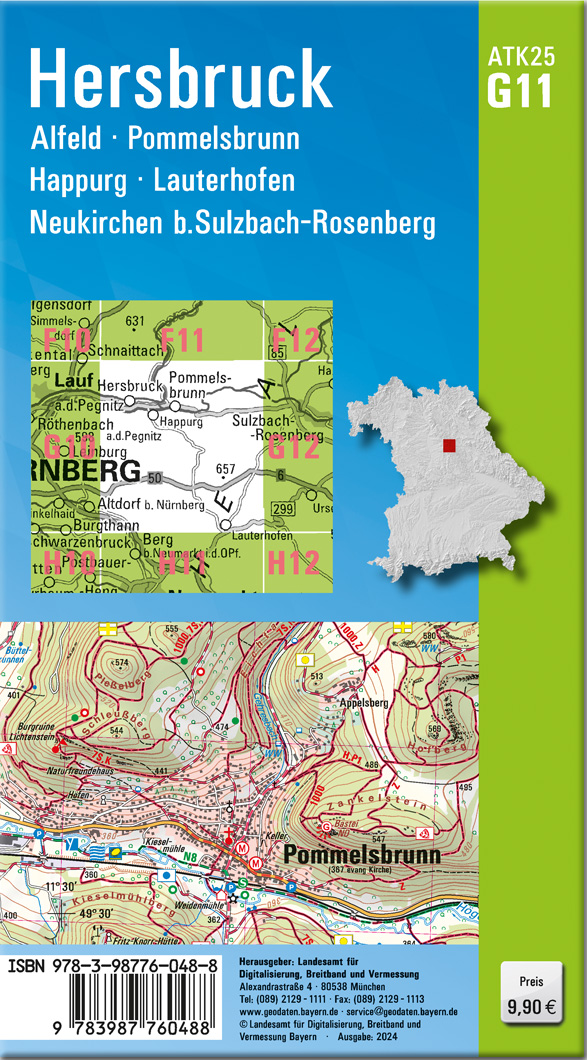 Wer es genau wissen will, greift zur ATK25. Diese Kartenserie im Maßstab 1:25000 bildet mit ihrer detaillierten Darstellung das komplette Verkehrsnetz mit allen Straßen und Wegen ab.237 Einzelblätter stellen Bayern flächendeckend dar. Ein Kartenblatt umfasst ca. 21 km x 22 km.Was bietet die ATK25?- individuelle Freizeitgestaltung mit allen ausgeschilderten Wander- und Radwanderwegen- sichere Orientierung auch abseits der markierten Routen- umfangreiches Spektrum an Freizeiteinrichtungen und Sehenswürdigkeiten- anschauliche Wiedergabe der GeländeformenKartenblatt ATK25-G11 Hersbruck:REGION: Oberpfalz, Mittelfranken, Fränkische AlbORTE: Hersbruck, Alfeld, Pommelsbrunn, Happurg, Lauterhofen, Neukirchen b.Sulzbach-Rosenberg, Birgland