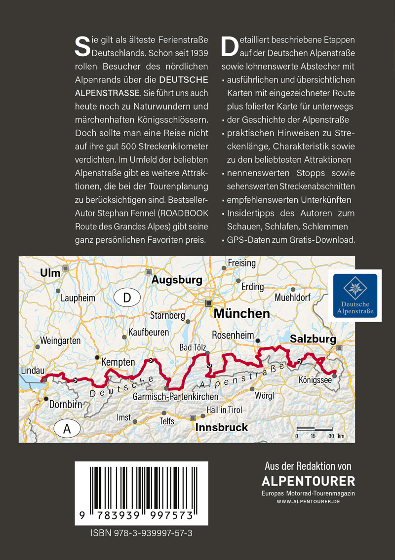 Sie gilt als älteste Ferienstraße Deutschlands. Schon seit 1939 rollen Besucher des nördlichen Alpenrands über die DEUTSCHE ALPENSTRASSE. Sie führt uns auch heute noch zu Naturwundern und märchenhaften Königsschlössern. Doch sollte man eine Reise nicht auf ihre gut 500 Streckenkilometer verdichten. Im Umfeld der beliebten Alpenstraße gibt es weitere Attraktionen, die bei der Tourenplanung zu berücksichtigen sind. Bestseller-Autor Stephan Fennel (ROADBOOK Route des Grandes Alpes) gibt seine ganz persönlichen Favoriten preis.Zum Buch gibt es eine herausnehmbare, folierte Straßenkarte der Deutschen Alpenstraße und ihren lohnenswerten Abstechern. Wetterfest, reißfest, beschreibbar - perfekt für unterwegs.