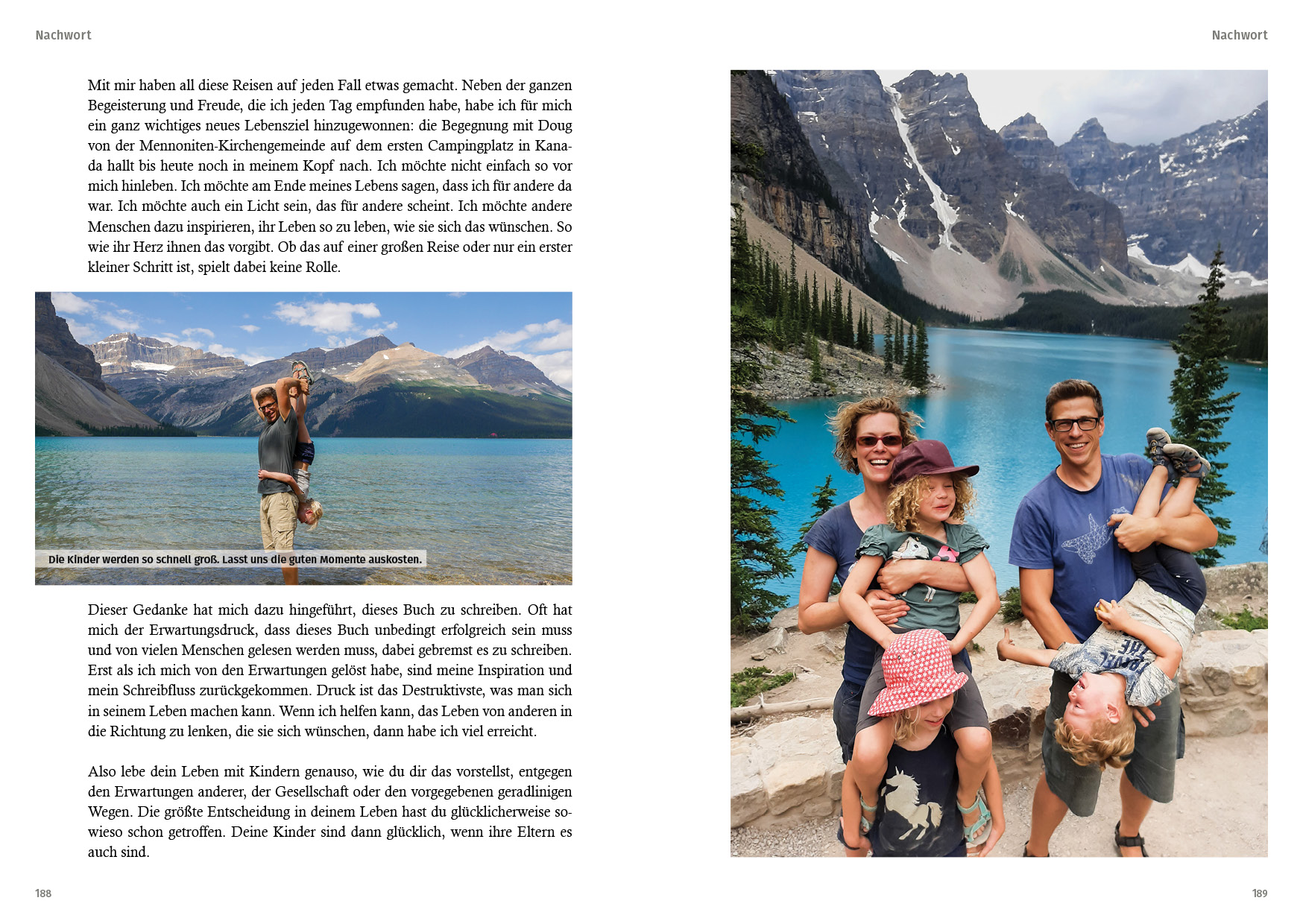 Wie wollen wir als Familie leben? Wie können wir uns auf Reisen gemeinsam weiterentwickeln? Was wollen wir unseren Kindern mitgeben? In ihrer Elternzeit fernab von Job, Schule und Verpflichtungen brechen Stefan und Julia mit ihren drei Kindern ins Abenteuer auf: vier Monate Kanada und Mittelamerika. Sie kaufen einen alten Van und reisen in die Freiheit. Leben Lagerfeuerromantik in den Rocky Mountains, wagen sich auf Gletscher und begegnen Bären. Über die Freiwilligen-Organisation Workaway arbeiten sie gemeinsam mit KanadierInnen auf Farmen und lernen, wie autarkes Familienleben in einer Earthship Gemeinschaft läuft. In Mexiko baden sie in funkelndem Meeresleuchten, besuchen eine Dorfschule in Guatemalas indigenen Gemeinden und streicheln Rochen in Belize.Dieses Buch ist mehr als die Geschichte einer Reise. Es ist eine Erzählung von Mut und vom Scheitern, vom Reiz des Aufbrechens und Ankommens und von persönlichen Einblicken in ein ungewöhnliches Familienleben. Die wichtigste Botschaft: Glückliche Eltern haben glückliche Kinder. Auch mit Kindern können wir unsere Träume verwirklichen.
