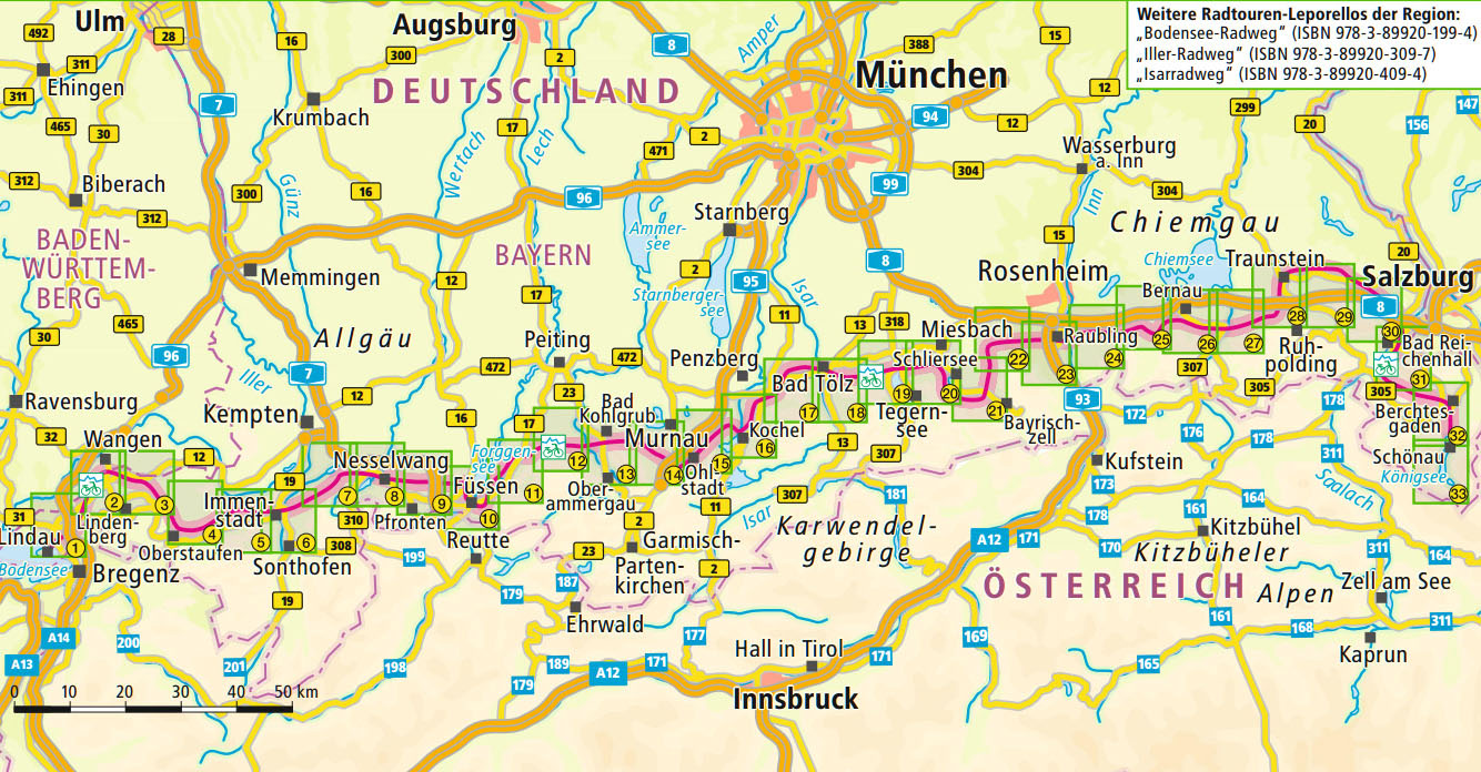 Die landschaftlich reizvolle Strecke startet in Lindau am Bodensee und hat Berchtesgaden zum Ziel. Die praktische Leporello-Falzung teilt die Strecke in kleine Abschnitte und macht durch Anzeigen und Texteinschübe auf Einkehrmöglichkeiten und Sehenswürdigkeiten aufmerksam. Die erste Seite der Radwanderkarte gibt einen Gesamtüberblick über die Landschaften, die durchquert werden. Kondition ist gerade im Voralpenland und im Berchtesgadener Land gefragt.Von Lindau am Bodensee verläuft der 418 km lange Radweg quer durch das hügelige Voralpenland bis Berchtesgaden und zum Königssee.Leporello mit 33 Teilkarten.
