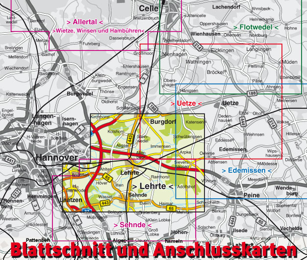 - großer Blattschnitt in 1:25.000 aktuell bis in alle Nachbarorte (im Westen mit der Hannover-Messe, im Norden mit Burgdorf , im Süden mit Sehnde).