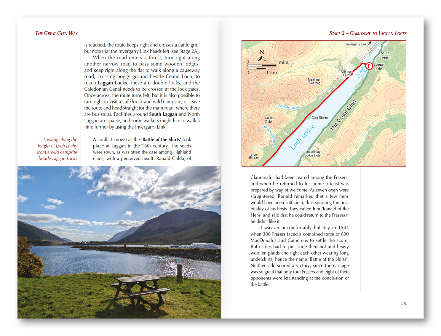 The route is described in both directions in 6 stages of between 12 and 31km (8–19 miles), with both low and high-level options for the central stages. Also included is an alternative route along the north shore of Loch Oich via Invergarry.