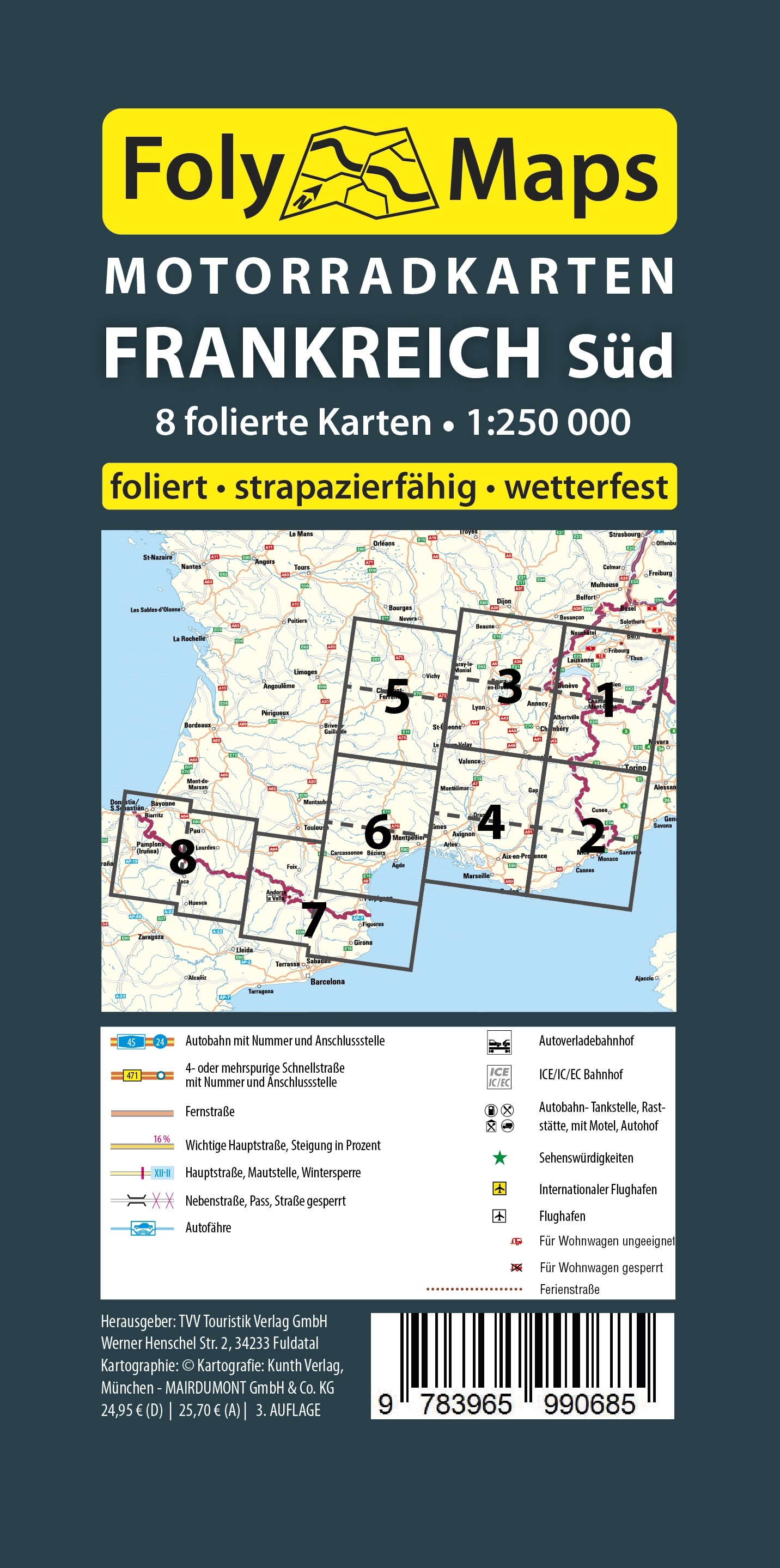 Entdecke die Welt mit FolyMaps, Deinen unverzichtbaren Begleitern für jeden Roadtrip. Motorradkarten-Set Frankreich Süd, bestehend aus 8 laminierten Karten, die im übersichtlichen Tourenmaßstab 1:250.000 die Regioenen Rhônes-Alpes, Provence-Cote d´Azur, Pyrenäen, Zentralmassiv abdecken. In einer praktischen Umtasche mit Reißverschluß. Frankreich bietet wunderschöne Strecken für Motorradfahrer. Dieses Kartenset mit 8 gut lesbaren und vor allem beidseitig bedruckten sowie laminierten Einzelkarten passt perfekt in jeden Tankrucksack und lässt sich flexibel falten. Wetterfest und wieder beschreibbar behält man auch bei rauem Wetter den Durchblick und kann Lieblingstouren individuell auf den Karten markieren.Die FolyMap Straßen- & Tourenkarten sind nicht nur robust und wetterfest, sondern auch reißfest und beschreibbar, ideal für das Notieren eigener Routen und Ideen. Mit einem handlichen Format und einem Maßstab von 1:250.000, passen sie perfekt in jeden Tankrucksack. Zusätzlich bietet die Reihe Spezialkarten für außergewöhnliche Ziele, sodass jede Tour zu einem einzigartigen Erlebnis wird. Ideal für Motorradreisende, die Wert auf Qualität und Zuverlässigkeit legen.Die Features des Motorradkarten-Set Frankreich Süd im Überblick:* 8 foliert Kartenblätter* strapazierfähig* wetterfest* Maßstab 1:250.000* Übersichtliche Kartographie* Umtasche mit ReißverschlussDie Karten enthalten keine Tourentipps oder Hotelempfehlungen.
