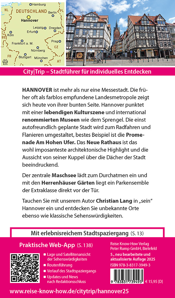 Dieser aktuelle Stadtführer ist der ideale Begleiter, um alle Seiten der niedersächsischen Landeshauptstadt selbstständig zu entdecken:- Die wichtigsten Sehenswürdigkeiten und Museen der Stadt sowie weniger bekannte Attraktionen und Viertel ausführlich vorgestellt und bewertet- Faszinierende Architektur: barocke Gartenanlagen, mittelalterliche Fachwerkhäuser und wilhelminische Prachtbauten - Abwechslungsreicher Stadtspaziergang- Erlebnisvorschläge für einen Kurztrip nach Hannover- Abstecher in die Calenberger Neustadt und an den Maschsee- Shoppingtipps vom traditionellen Markt bis zu den schönsten Modegeschäften- Die besten Lokale der Stadt - Tipps für die Abend- und Nachtgestaltung: vom Studentenviertel Linden bis zum Opernbesuch- Viele Infos zur Messestadt Hannover- Hannover zum Durchatmen: Maschsee, Stadtpark, Tiergarten- Ausgewählte Unterkünfte von preiswert bis ausgefallen- Alle praktischen Infos zu Anreise, Preisen, Stadtverkehr, Touren, Events, Hilfe im Notfall ...- Hintergrundartikel mit Tiefgang: Geschichte, Mentalität der Bewohner, Leben in der Stadt ...- Faltplan zum HerausnehmenDazu: kostenlose Web-App für Smartphone, Tablet und PC mit Stadtplan- und Satellitenansichten passend zum Text, Routenführung zu allen beschriebenen Sehenswürdigkeiten, Verlauf des Stadtspaziergangs, seitenbezogenen Updates nach Redaktionsschluss++++ CityTrip - die aktuellen Stadtführer von Reise Know-How, mit über 160 Städtezielen die weltweit umfangreichste Kollektion. Fundiert, übersichtlich, praktisch.REISE KNOW-HOW - Reiseführer für individuelle Reisen