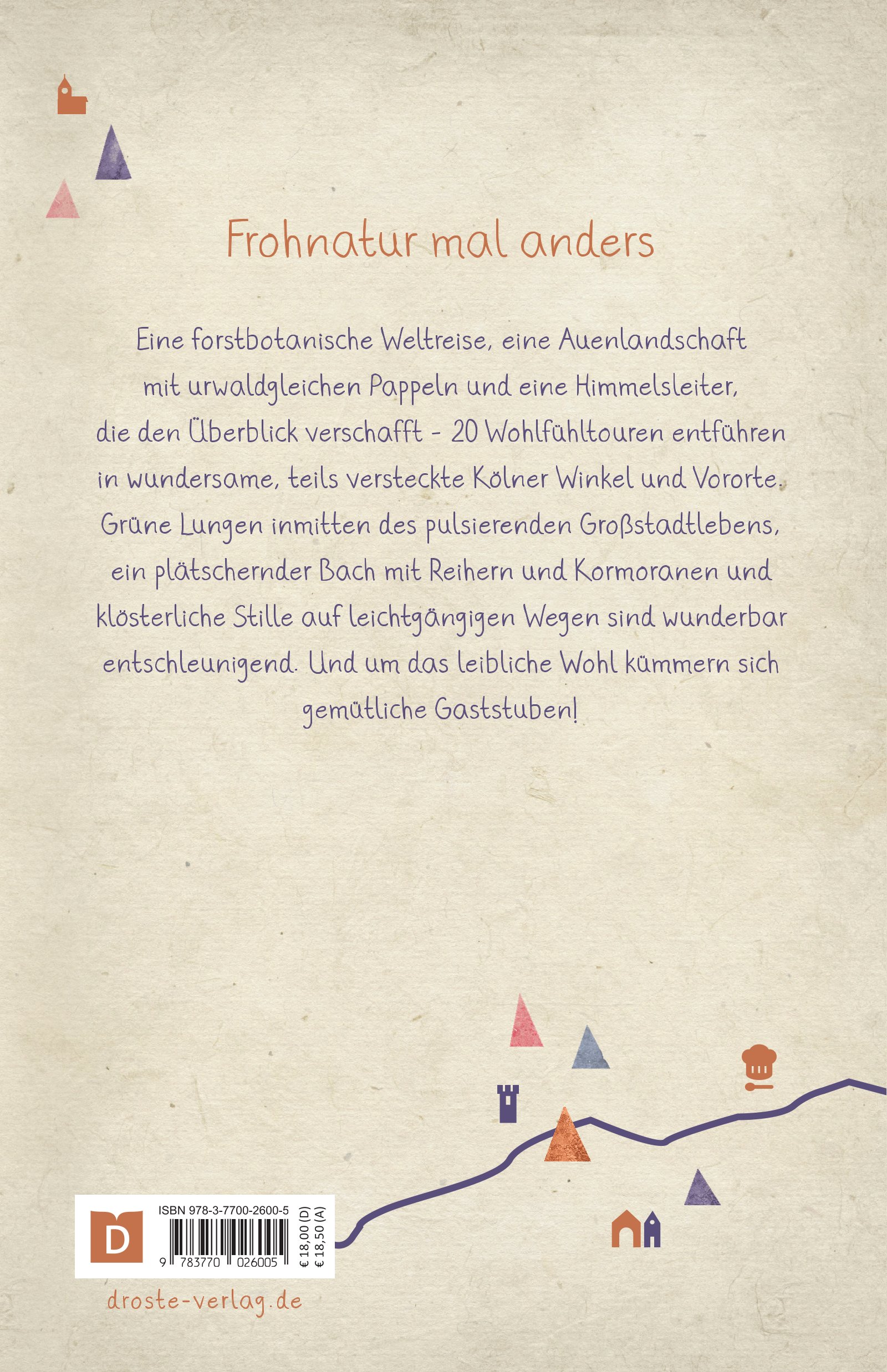 Eine forstbotanische Weltreise, eine Auenlandschaft mit urwaldgleichen Pappeln und eine Himmelsleiter, die den Überblick verschafft - 20 Wohlfühltouren entführen in wundersame, teils versteckte Kölner Winkel und Vororte. Grüne Lungen inmitten des pulsierenden Großstadtlebens, ein plätschernder Bach mit Reihern und Kormoranen und klösterliche Stille auf leichtgängigen Wegen sind wunderbar entschleunigend. Und um das leibliche Wohl kümmern sich gemütliche Gaststuben!