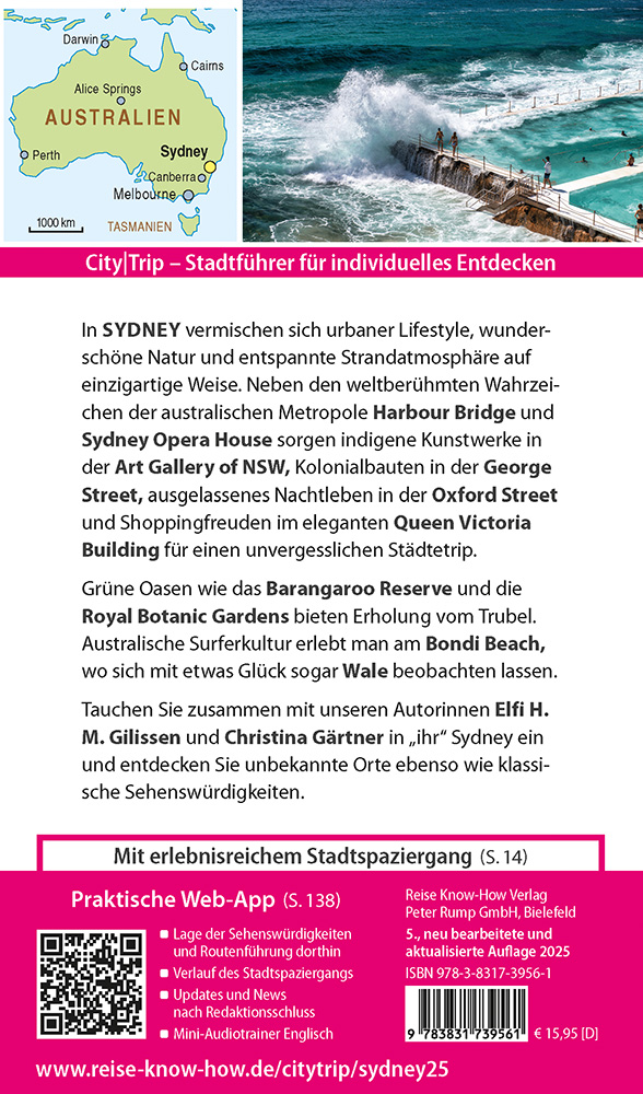 Dieser aktuelle Stadtführer ist der ideale Begleiter, um alle Seiten der australischen Metropole Sydney selbstständig zu entdecken:- Die wichtigsten Sehenswürdigkeiten und Museen der Stadt sowie weniger bekannte Attraktionen und Viertel ausführlich vorgestellt und bewertet- Faszinierende Architektur zwischen Art déco und Moderne- Abwechslungsreicher Stadtspaziergang- Erlebnisvorschläge für einen Kurztrip- Erkundungen von Inner East, Glebe, Bondi Beach und Manly- Shoppingtipps vom Kunsthandwerksmarkt bis zu Konsumtempeln- Die besten Lokale der Stadt und allerlei Wissenswertes über die australische Küche- Tipps für die Abend- und Nachtgestaltung: vom Theater bis zu angesagten Pubs und schicken Bars- Reizvoll anders: Meeresfreibäder- Sydney zum Träumen und Entspannen: Royal Botanic Gardens, Hyde Park und Küstenwanderwege- Ausgewählte Unterkünfte von preiswert bis ausgefallen- Alle praktischen Infos zu Anreise, Preisen, Stadtverkehr, Touren, Events, Hilfe im Notfall ...- Hintergrundartikel mit Tiefgang: Geschichte, Mentalität der Bewohner, Leben in der Stadt ...- Kleine Sprachhilfe Englisch für Australien mit den wichtigsten Vokabeln für den Reisealltag- Faltplan zum HerausnehmenDazu: kostenlose Web-App für Smartphone, Tablet und PC mit Stadtplan- und Satellitenansichten passend zum Text, Routenführung zu allen beschriebenen Sehenswürdigkeiten, Verlauf des Stadtspaziergangs, seitenbezogenen Updates nach Redaktionsschluss sowie einem Mini-Audiotrainer Englisch.+++ CityTrip - die aktuellen Stadtführer von Reise Know-How, mit über 160 Städtezielen die weltweit umfangreichste Kollektion. Fundiert, übersichtlich, praktisch.